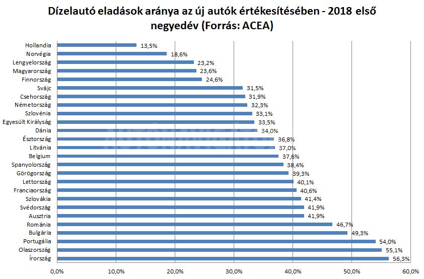 Ugyanakkor az eladásoknak még mindig csak 5,1 százalékát teszik ki utóbbiak, míg a benzinesek 55, a dízelek 37,9 százalékot képviselnek, további 1,5 százalék pedig az egyéb, például földgázhajtású járműveké.Hazánkban az EU átlaga alatti a dízelek értékesítése, aminek persze nem elsősorban a környezettudatosság, sokkal inkább az árérzékenység az oka