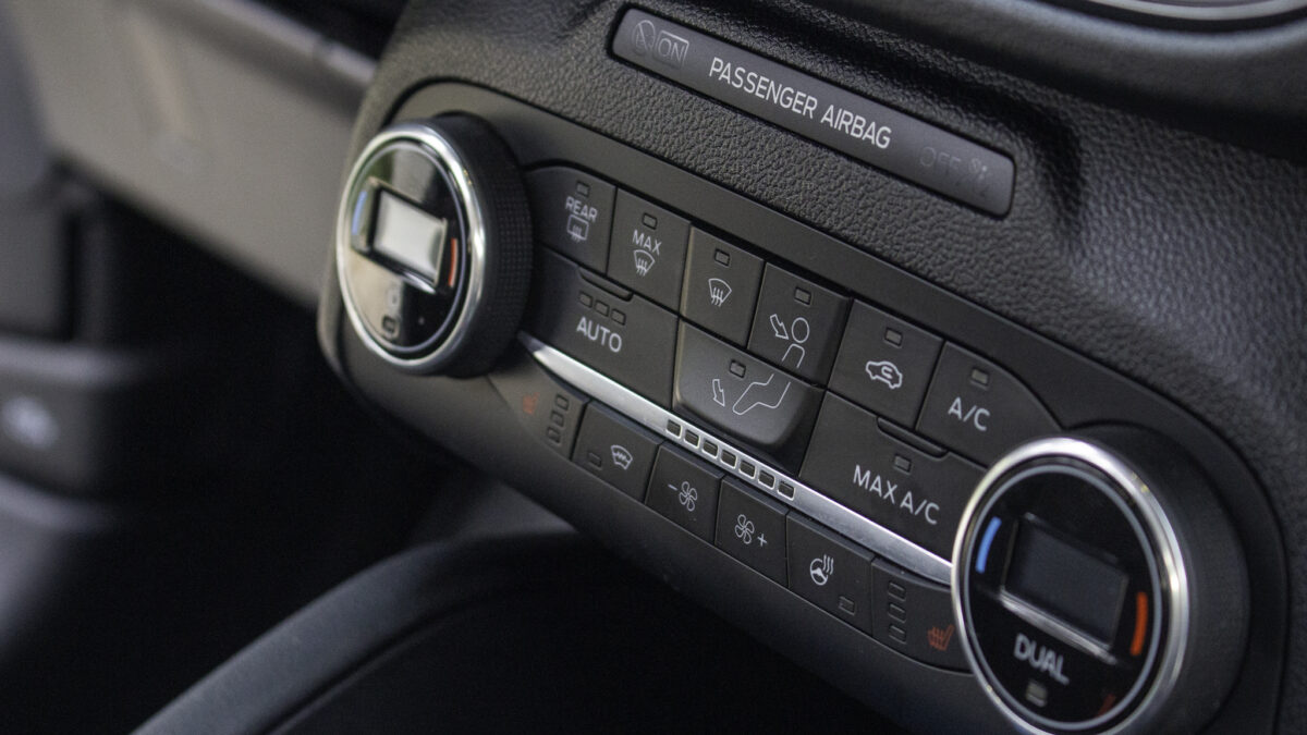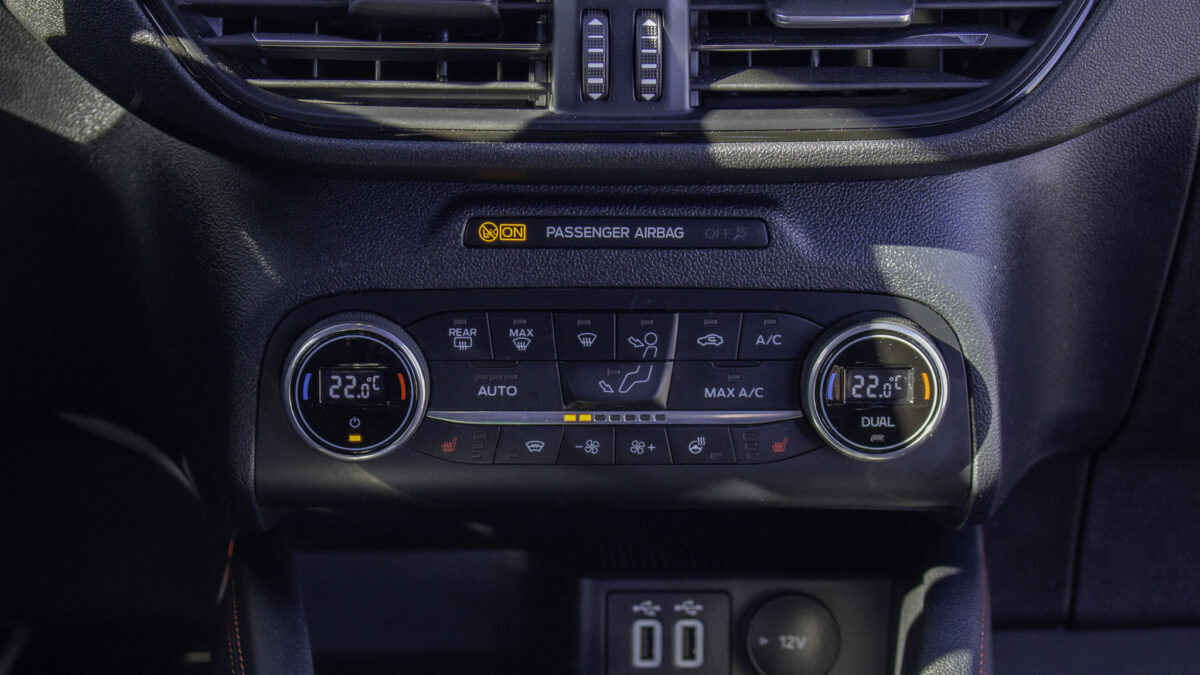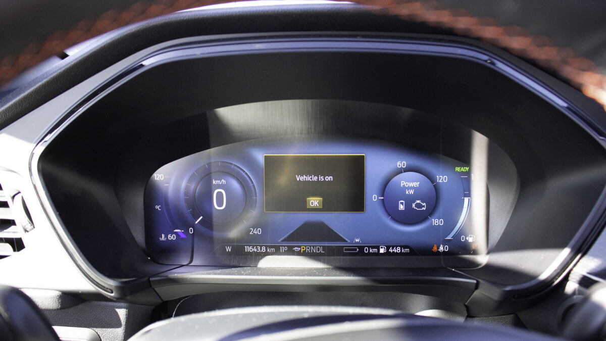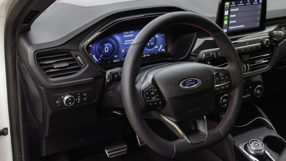 A Ford Sync új verziója elég erős és nagy tudású. Könnyen navigálható a rendszer, tud Apple CarPlay-t és Android Auto-t is vezetékről. És bár sajnos nem ússzuk meg az ujjlenyomatokat, mivel kizárólag érintőképernyő van, a beltér klimatizálását és különböző elemeinek fűtését egy gombos és tekerős klímakonzolon tudjuk megtenni. Nem haptikus felületeket kell keresgélnünk és babrálnunk rajtuk. Öröm! A kinézete viszont valahogy kicsit Windows Vista hatású lett. Tudom, hogy “a Ford az kék”, de lehetett volna valami olyan árnyalatot találni, ami nem a népszerű operációs rendszer boot menüjéből lehet ismerős.