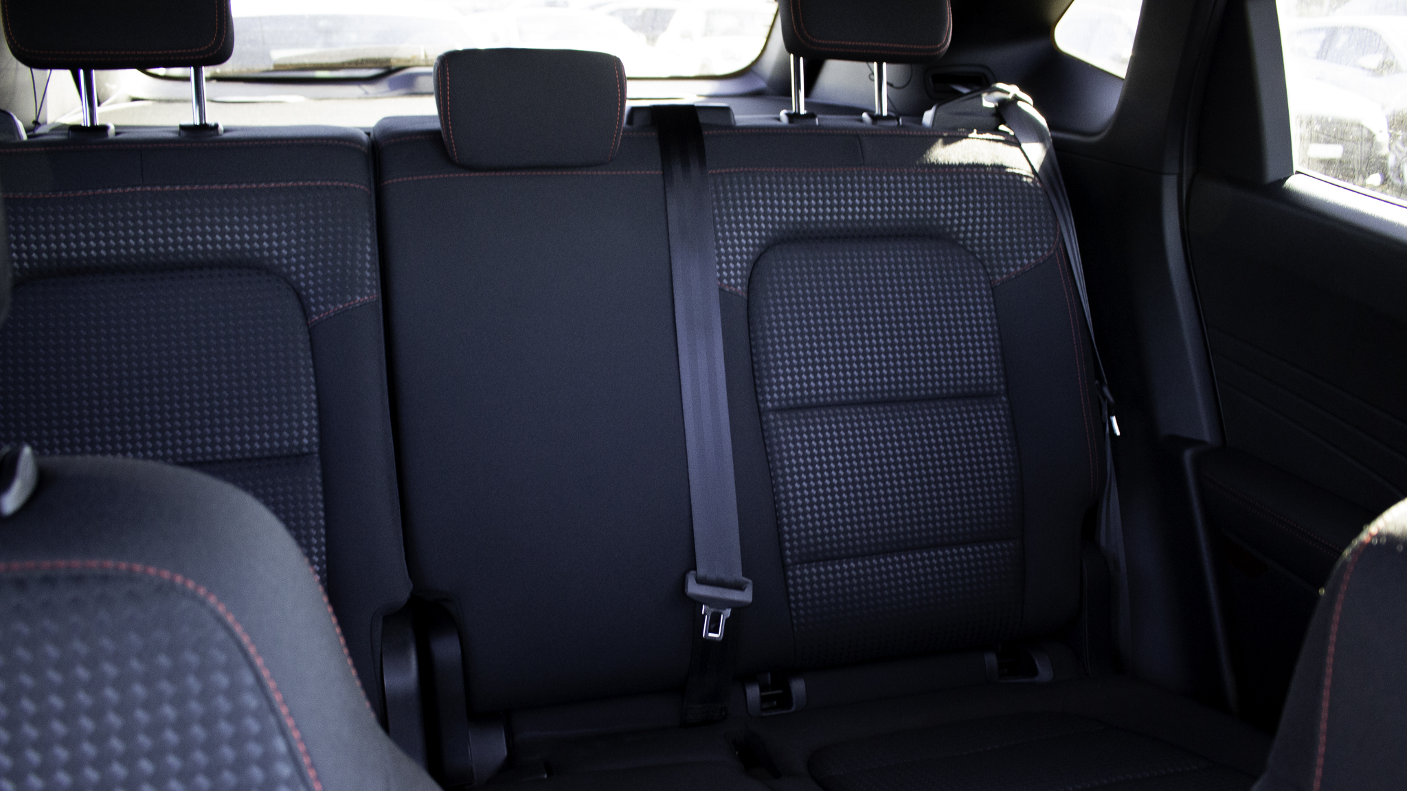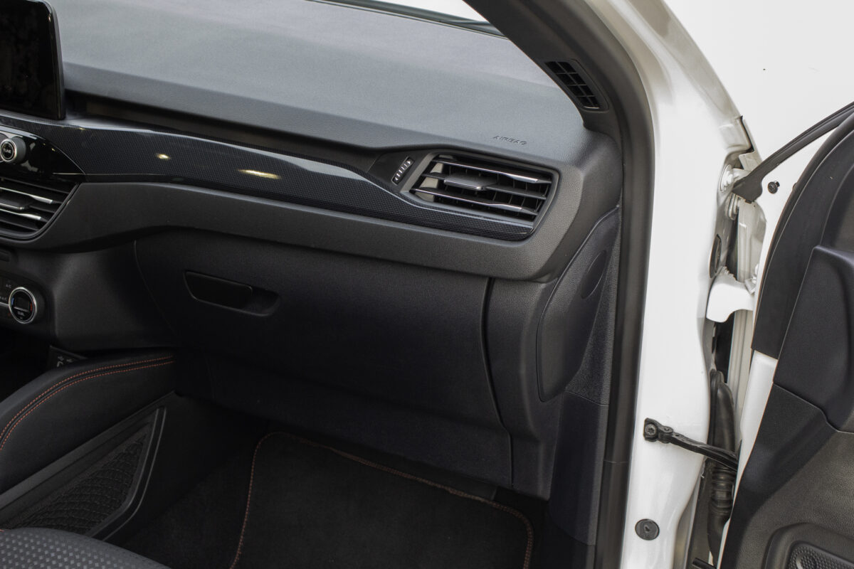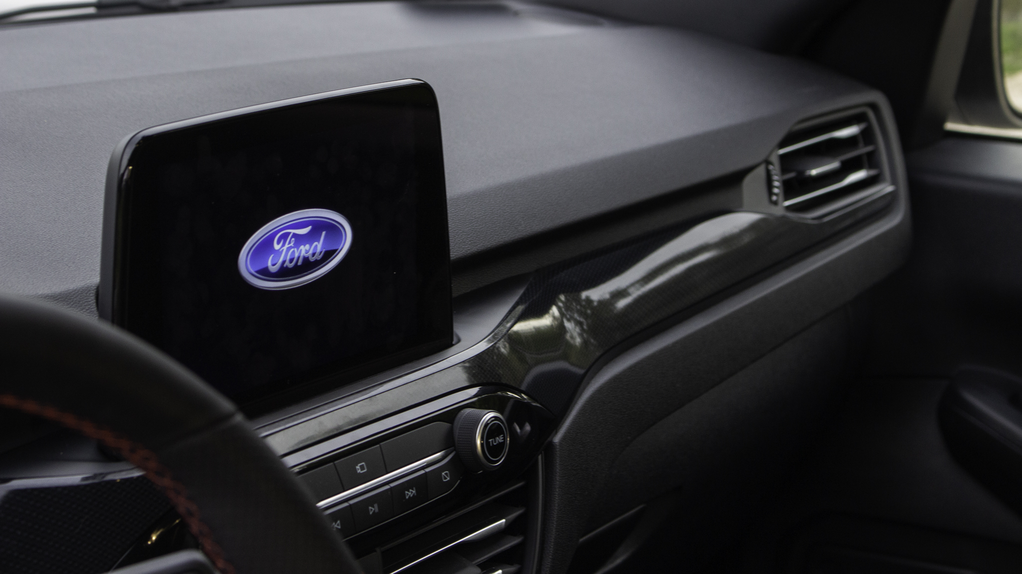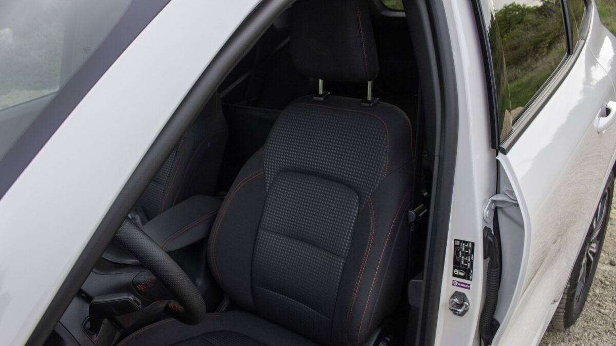 Az ST-Line felszereltséghez jár a piros varrás a műszerfalra, a kormányra és az ülésekre, és sok-sok feketeség. Ami sajnos nem jár, az az oldaltartás az ülésekhez, és sajnálatos módon másik opció nincs is ezen a téren (a nemsokára érkező modellekben már lesz másfajta ülésre lehetőség). Szóval a sportos vezetést így el is felejthetjük, hacsak valamiért nem szeret az ember kapaszkodni a kormányba és úgy lobogni a beltérben. Szerencsére nem csak ezért nem hívogató a kanyarvadászat, de maradjunk még az enteriőrnél. Ami nagyon üdvözlendő, hogy a zongoralakkot teljesen elhagyták. Helyette igényes kivitelezésű szálcsiszolt fém hatású műanyagot tapogathatunk, meg műkarbon ajtó-, és műszerfalbetéteket.Jó anyag- és mintaválasztás jellemzi a belteret. A szálcsiszolt fémet imitáló részeknek jó a tapintása, a karbonmintás betétekről sem ordít, hogy nem igaziak