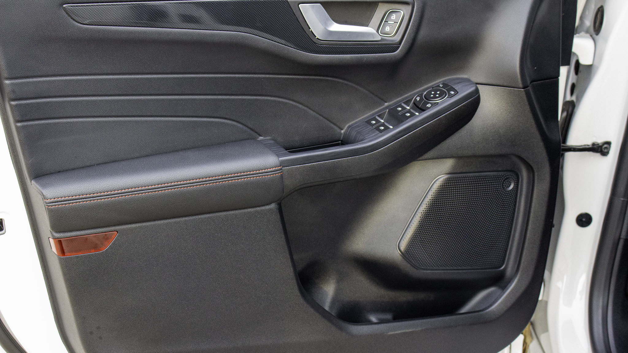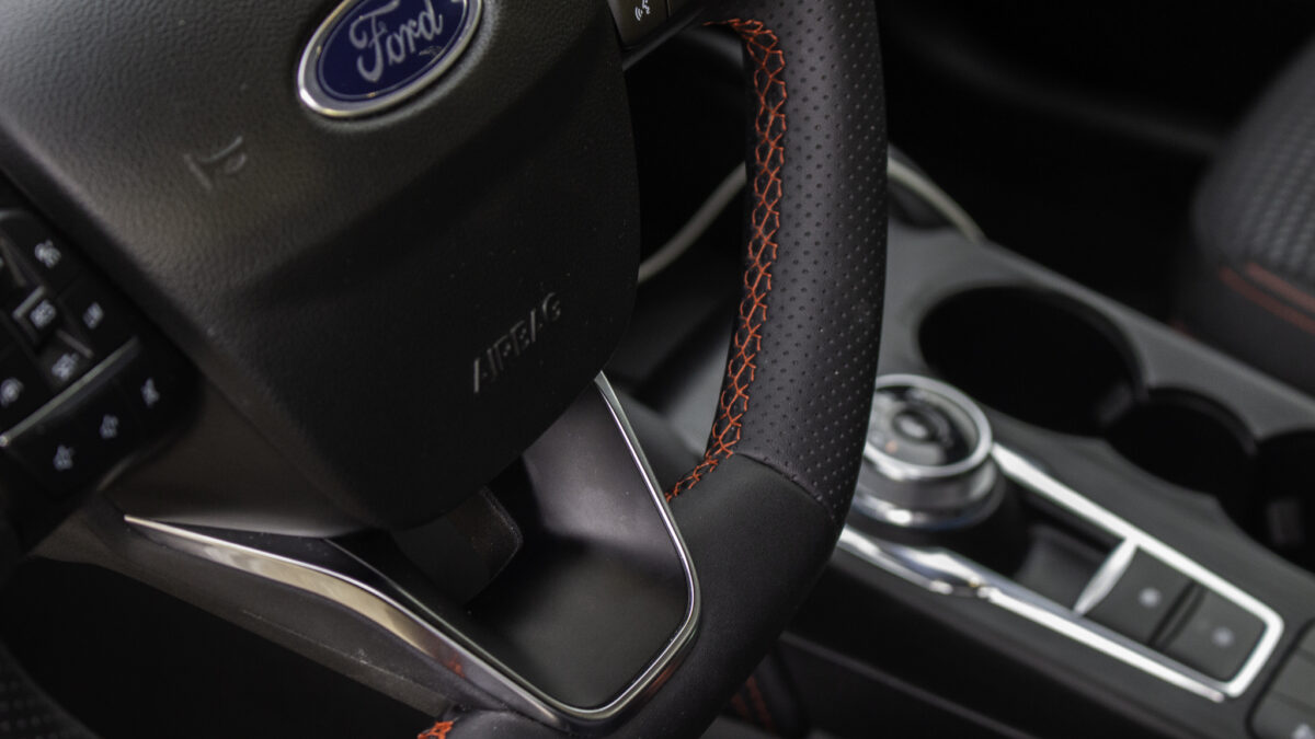 A kormány abszolút jó fogású, kellemes anyagú, és a piros varrás is szépen kidolgozott rajta. Alapvetően kellemes környezetet nyújt a Kuga