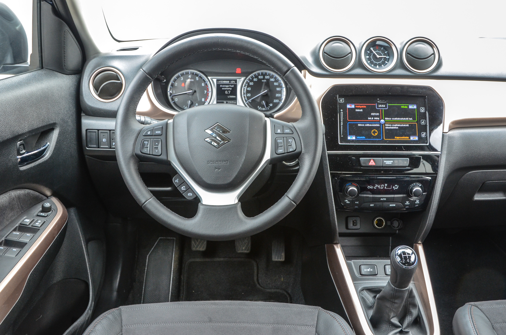 A Vitara nem egy mai darab a Suzuki palettáján. Első generációja 1988-ban jelent meg, három évvel ezelőtt pedig már a negyedik generációjába lépett. Tény, hogy a korábbi kompaktabb, robusztusabb, igazi terepjárós formáját kissé elveszítette és sokkal inkább városi autó lett, a piac nagy részét ez látszólag különösen nem zavarja. A méret növekedése és az elegánsabb kinézet jót tett neki, a Limited felszereltséggel pedig még inkább kitűnik a sok ezer testvérmodell közül. A Limited kiadást még Charles Bronzon is megirigyelné, ugyanis a dizájn kívül-belül kellően bronzos. A külsőt tekintve mindössze a felniben van, pontosabban lenne különbség, amit itt épp nem látunk, hiszen nem a Limited változat felnijét kapta meg a tesztautó. Minden bizonnyal a téligumi-garnitúra miatt. A kerekek fő ismertető jegye egyébként az, hogy a felni küllőinek széle bronz színű díszítést kapott.