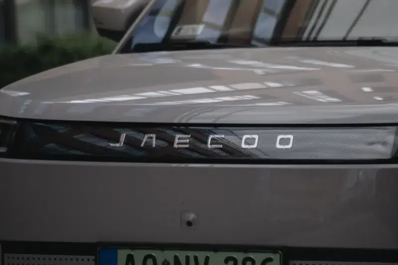 A divatos fényjáték helyett egy hatalmas Jaecoo felirat hirdeti az autó nevét, az orr jobb alsó sarkába rejtve pedig egy 5 EV logó a típusát és hajtásláncát, ezzel is a lényegretörő egyszerűséget hangsúlyozva. Semmi cifrázás, hiszen egy közel 1,9 m széles orr már önmagában is eléggé észrevehető.