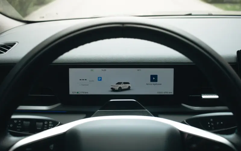 A 8,8 colos digitális műszerfal gyakorlatilag egy szabadon álló, keretnélküli kijelző. Egészen minimális mennyiségű de lényeges információkkal ellátva. Sebesség, asszisztens rendszerek visszajelzései és a még fenn maradó hatótáv. Valamint, egy egészen gyors és pontos forgalom felismerő kis grafika, ami menetközben mutatja az autó környezetében haladó egyéb járműveket. Na meg persze, hogy éppen melyik számot hallgatod, mert az is fontos ám.