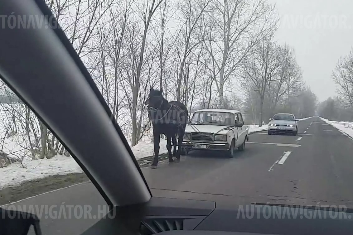 Bár a kisebb forgalmú közutakon nem tiltott a lovaskocsival való közlekedés, a lóval vontatott Lada - amit Csongrádban videóztak e héten - alighanem szabálytalan.