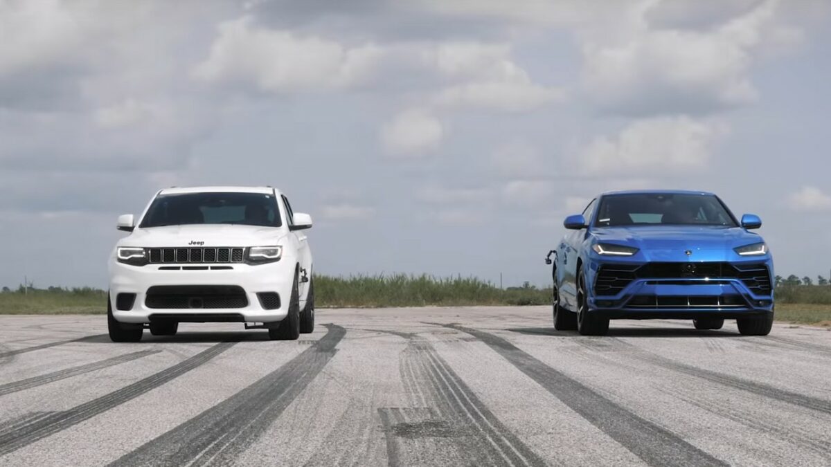 Egyenesen Európából érkezett a kihívó, a luxus sport SUV-k jelenlegi királya, a Lamborghini Urus. Motorja szintén V8-as, de két turbó lélegezteti, teljesítménye 650 lóerő és 850 Nm nyomaték, gyorsulásban pedig nagyjából ugyanolyan értékeket mutat fel, mint a Cherokee. Az első futamon a Trackhawk jobban startolt el, szinte azonnal egy autóhossznyi előnyre tett szert, viszont a célvonalig utolérte, sőt, meg is előzte az Urus. A második futam kicsit élesebbre sikerült, a rajt nagyon hasonló és az Urus csak félautós hosszt vert rá a Trackhawkra. A verseny nagyon éles, fej-fej melletti küzdelem, amiben vélhetően a különböző súly is közrejátszott, nem beszélve a gyorsabb váltóról a Lamborghini esetén. De itt a teljes verseny, a hangerőt ne felejtsétek el feltekerni!