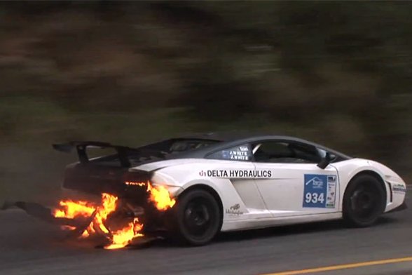 Az utolsó verseny végéhez közeledve a Jason és John White által nevezett fehér Lamborghini Gallardo második helyen haladt, 4 másodperccel Tony Quin Nissan GT-R-je mögött. Igyekeztek befogni Quint, de ekkor beütött a krach, a Gallardo hátuljából hatalmas lángnyelvek csaptak ki. Döntést kellett hozniuk, hogy kiállnak, és eloltják a tüzet, vagy nem törődnek semmivel, csak nyomják, ahogy a csövön kifér. [BANNER type="1"] Az utóbbit választották, és merészségüknek köszönhetően végül tíz másodperccel nissanos vetélytársuk előtt, első helyen értek célba. Ezután a lángokat is sikerült megfékezni, így csak az autó farrésze, s nem egésze égett porrá.