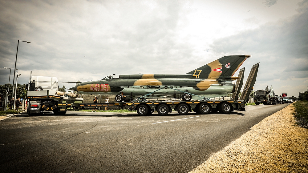 Impozáns látvány egy közúton közlekedő repülő, pláne egy olyan, amihez sokan még emlékeket is köthetnek. A MIG-21-ek 2000-ig repültek nálunk, most az egyiket kiállítják Pápán.