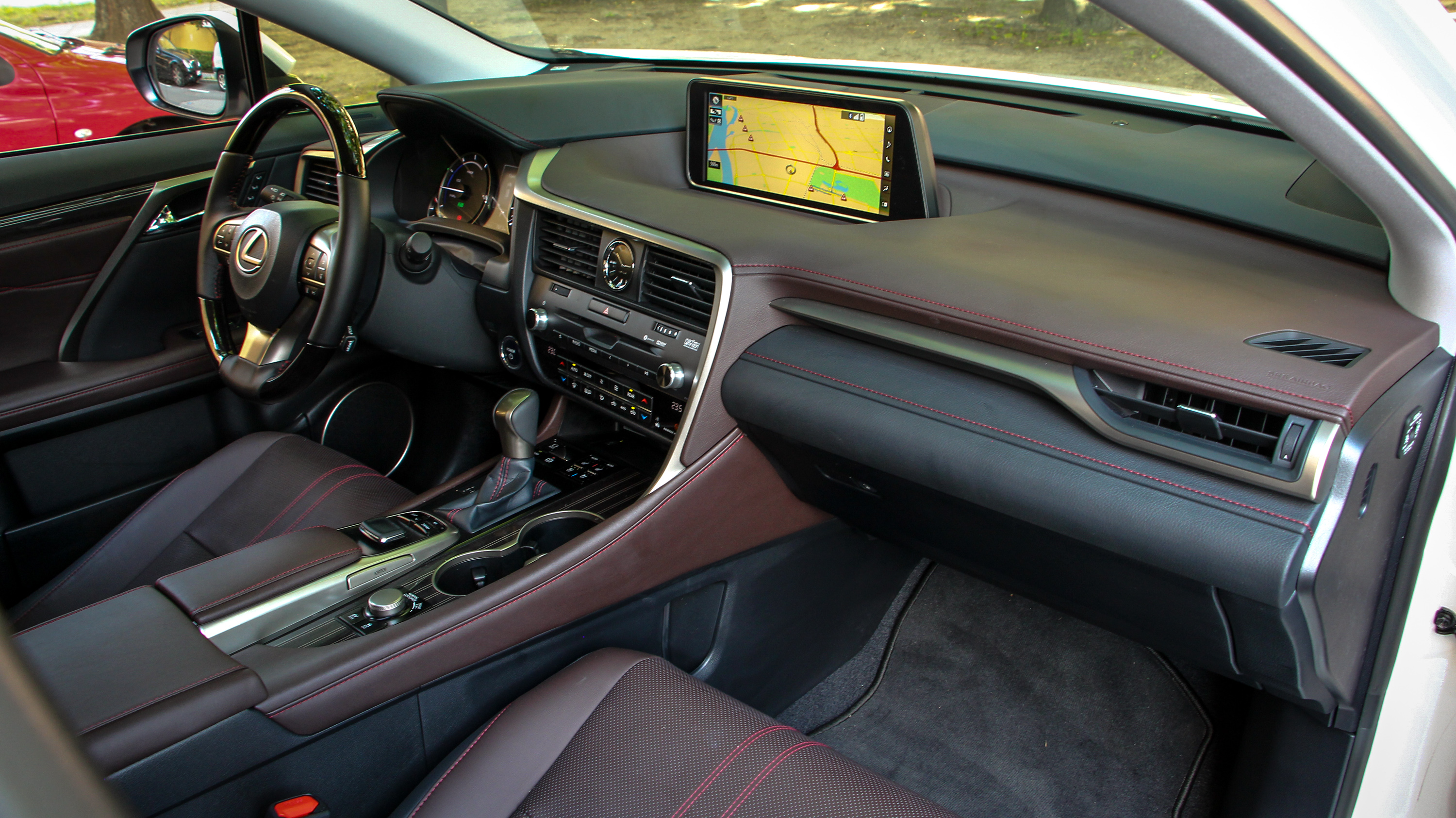 Az RX óriási, egy igazi bálna, ami ráadásul magas is, szép nagy hasznos teret foglal el a nagyvilágból és joggal gondolhatnánk azt, hogy akkor bent is legalább ennyire hatalmas. A helykínálat valóban kiváló, széles az utastér elöl-hátul, magasan ülünk, a plafon is messze van, de nem úgy ülünk benne, mint egy SUV-ban általában. Az egész olyan, mintha egy szedánt emeltek volna fel, a vezetői pozíció pont olyanra állítható, mivel a padló magas, a kormány pedig közel húzható.