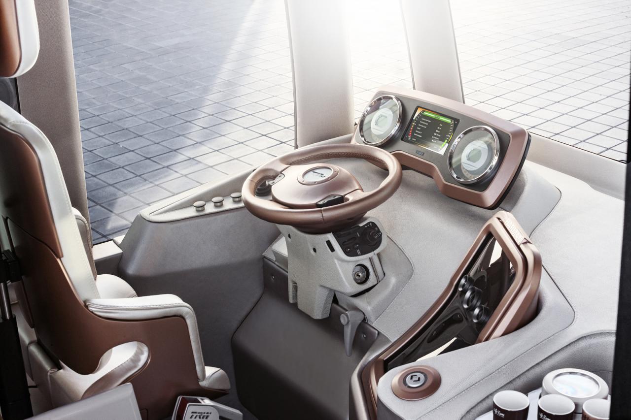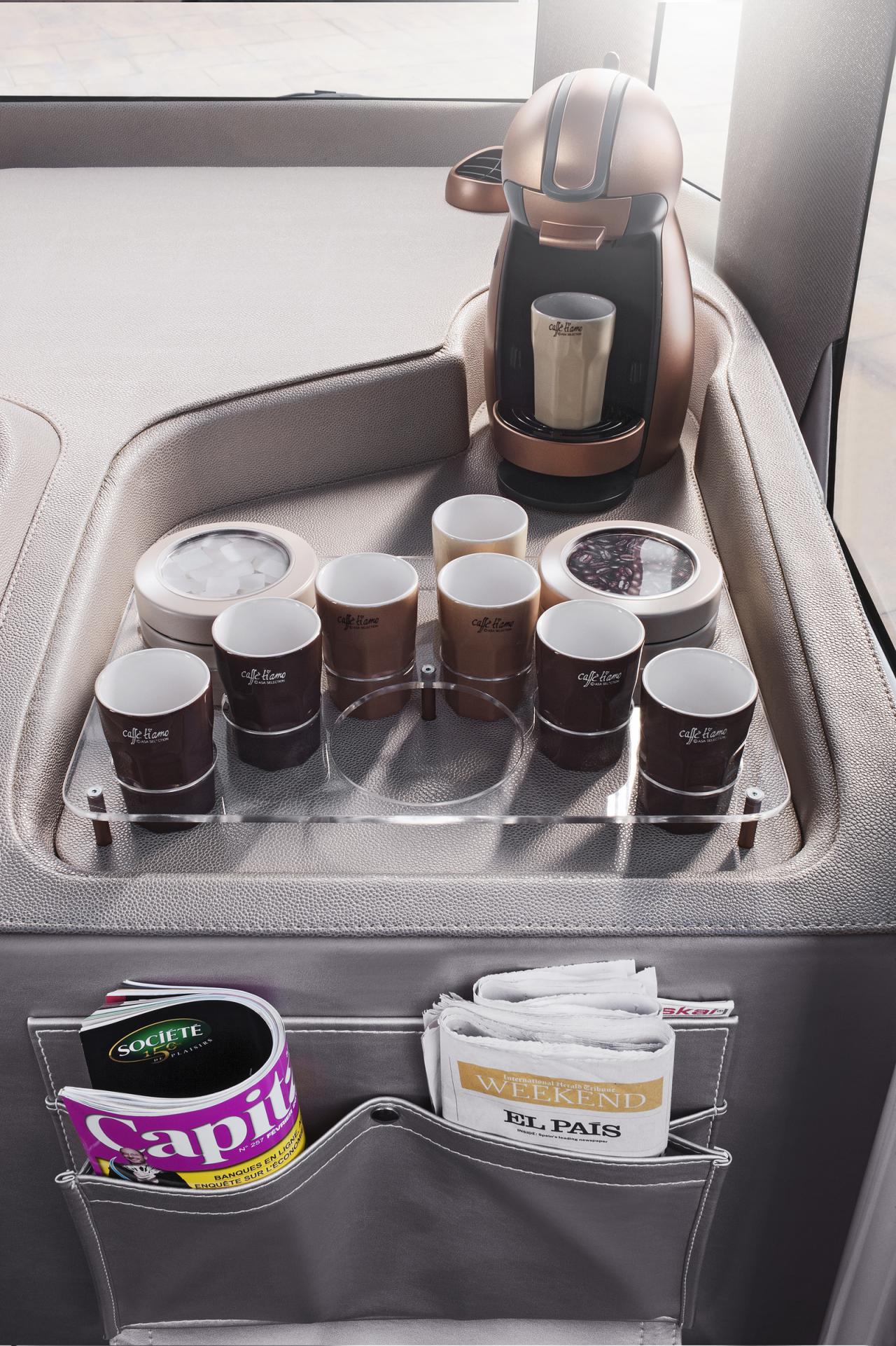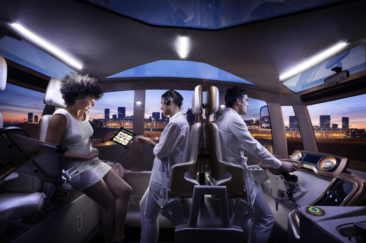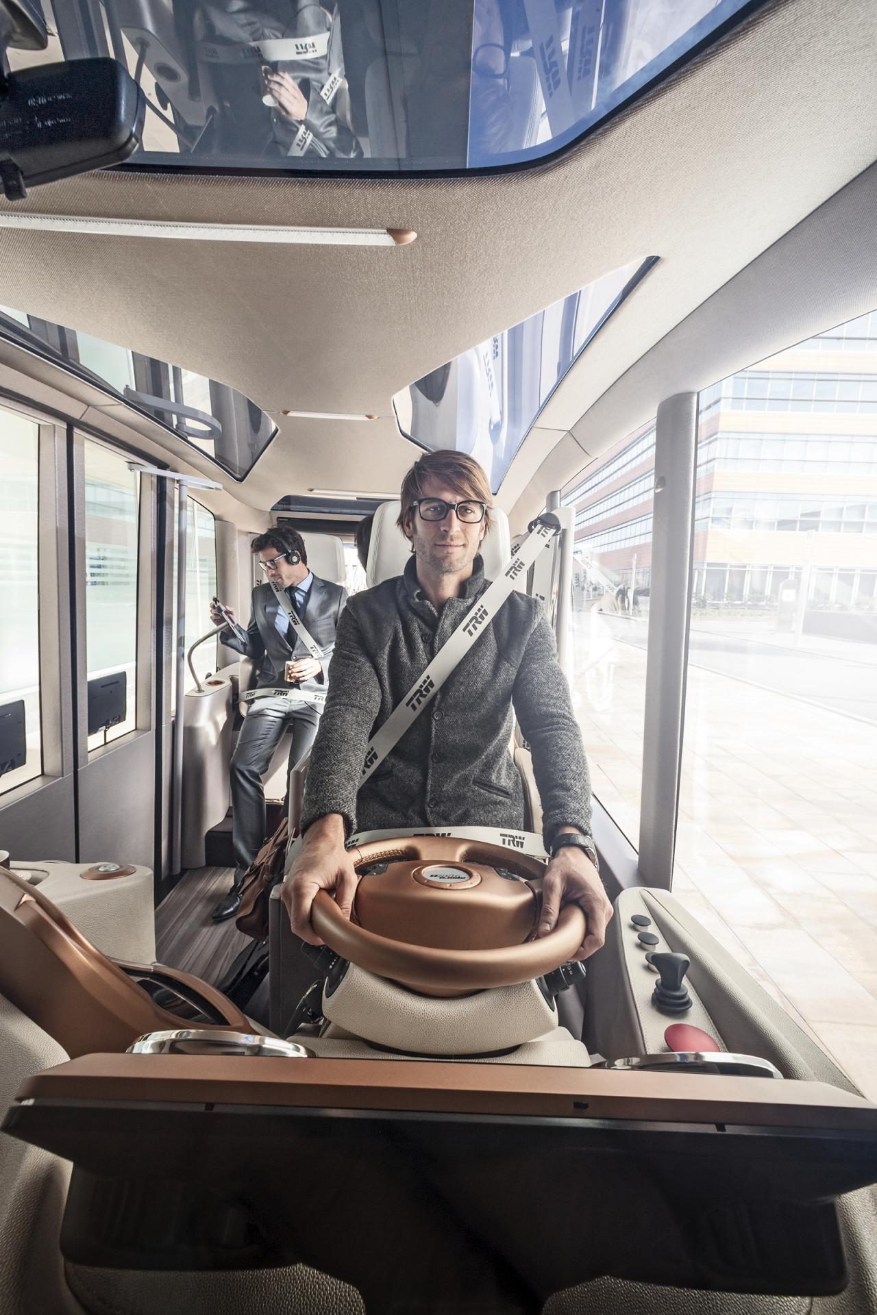 Buszos sofőrhelyzetben fektetett Renault Scénic II kormányt markolhat a szintén az említett modellből ismerős rádióvezérlőket, továbbá érintőképernyős, táblagépes középkonzolt, mellette kávéfőzőt, a szélvédő tövében pedig digitális és analóg műszereket egyaránt kapó sofőr