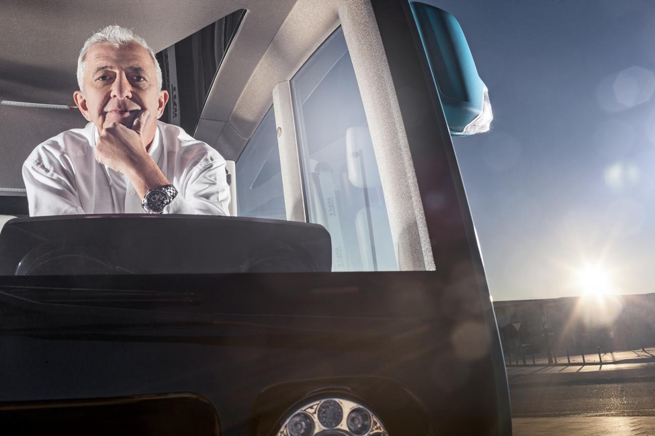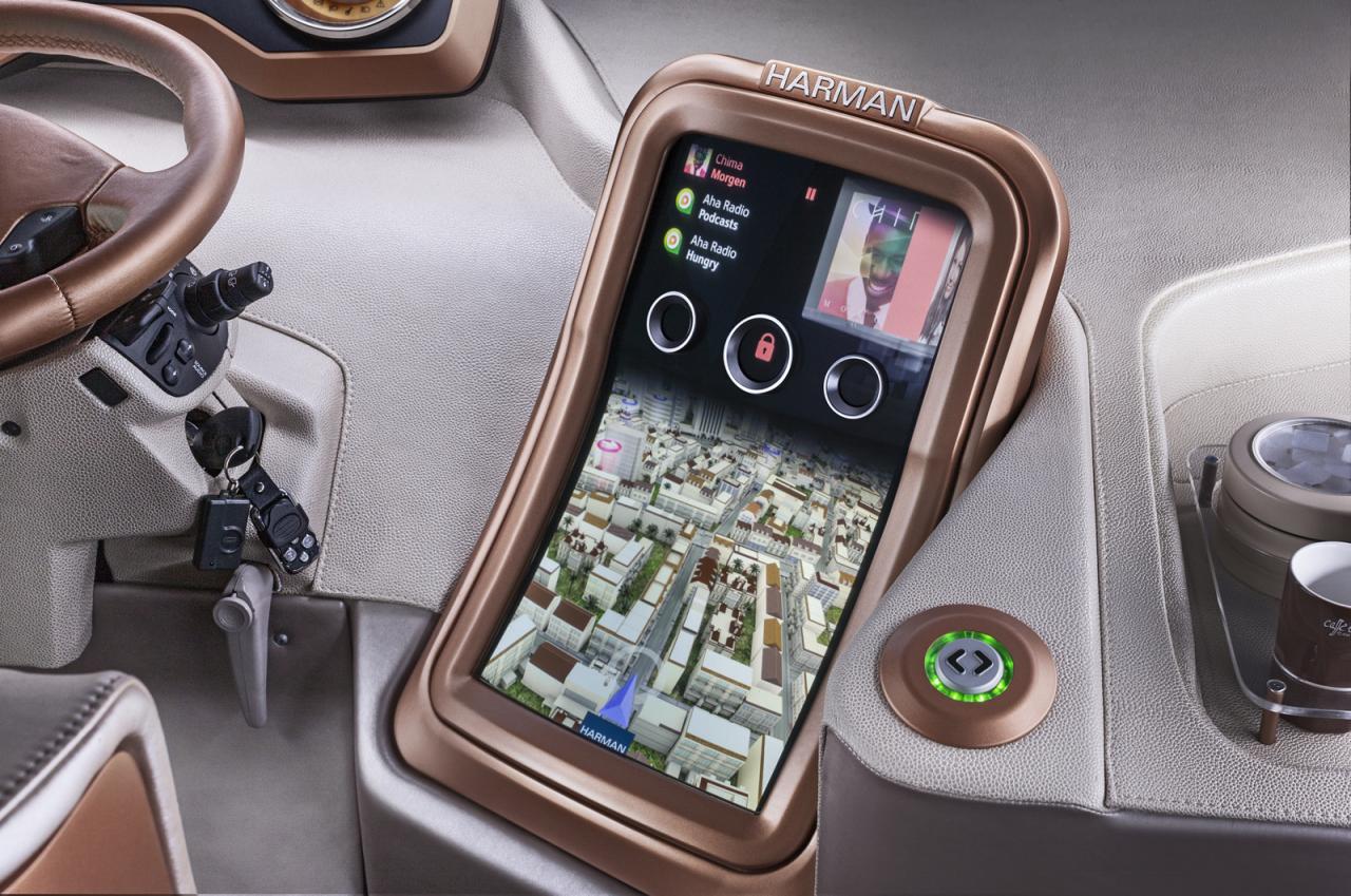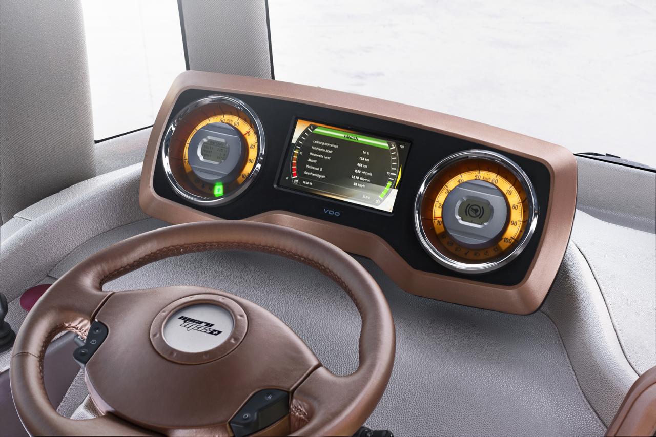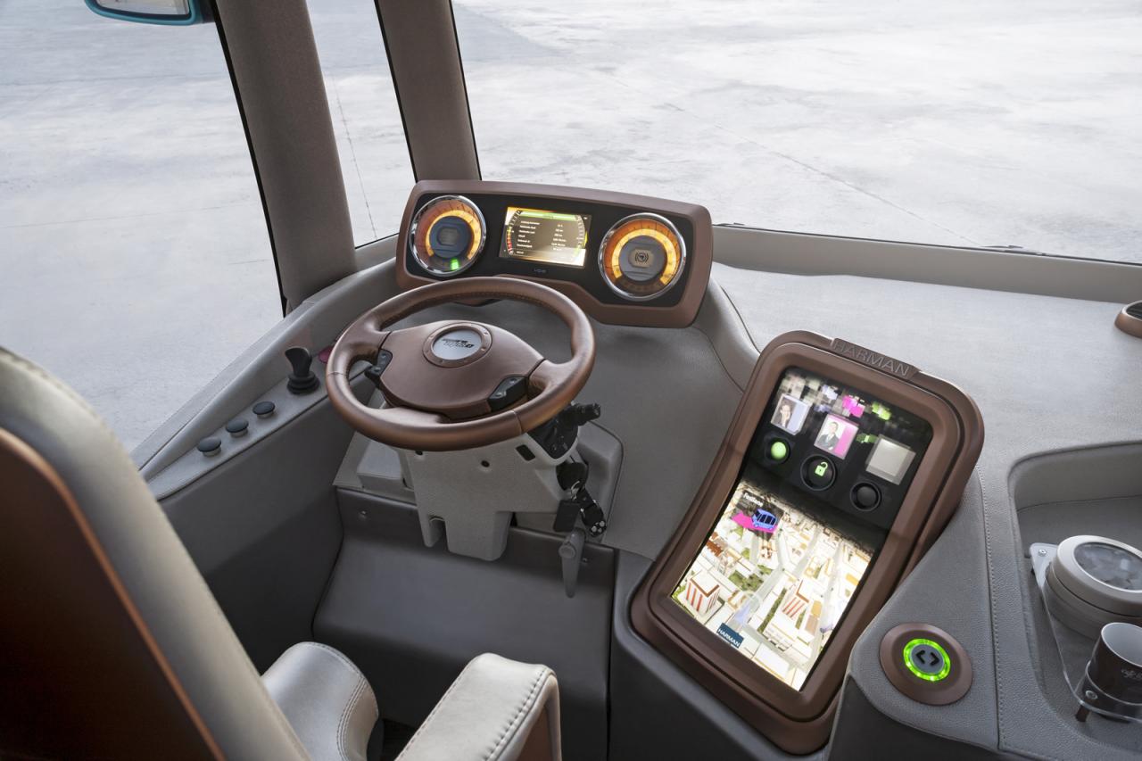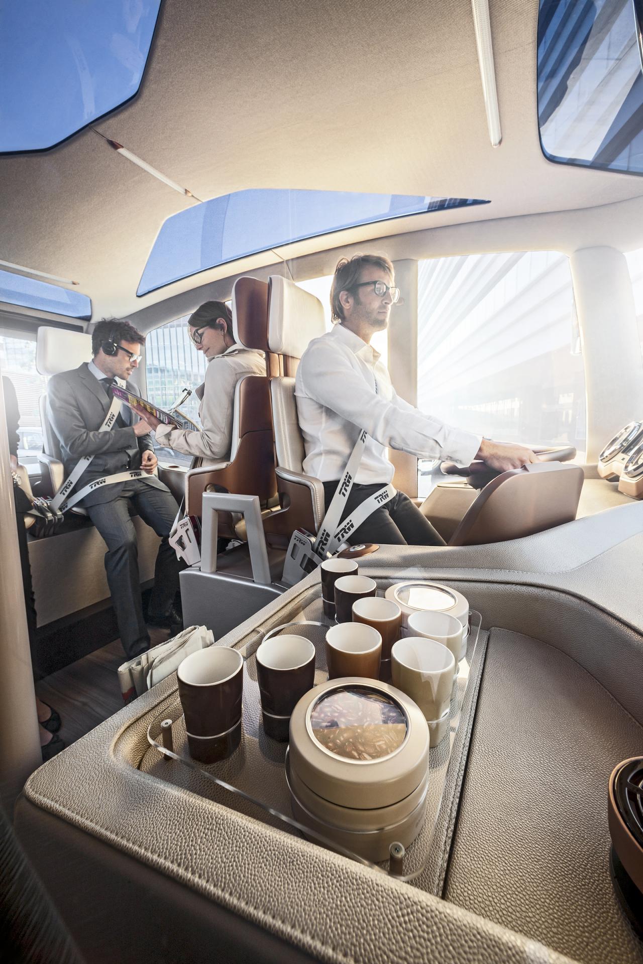 Buszos sofőrhelyzetben fektetett Renault Scénic II kormányt markolhat a szintén az említett modellből ismerős rádióvezérlőket, továbbá érintőképernyős, táblagépes középkonzolt, mellette kávéfőzőt, a szélvédő tövében pedig digitális és analóg műszereket egyaránt kapó sofőr