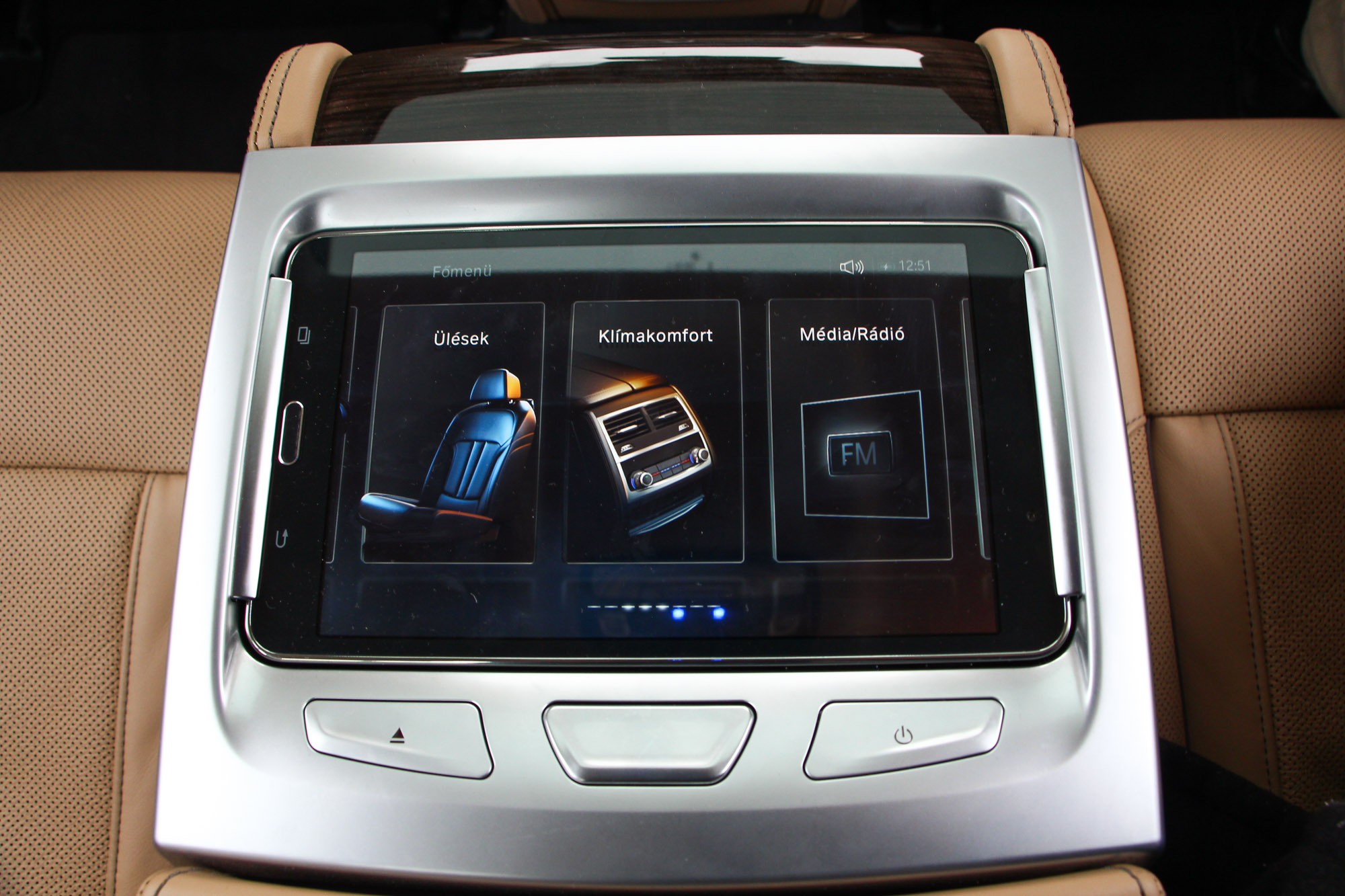 Mindkét sorban villanyos állítású, fantasztikusan kényelmes és pihentető ülések. A hátsó középkonzol fölhajtható, úgy akad egy nagyon kényelmetlen ötödik hely