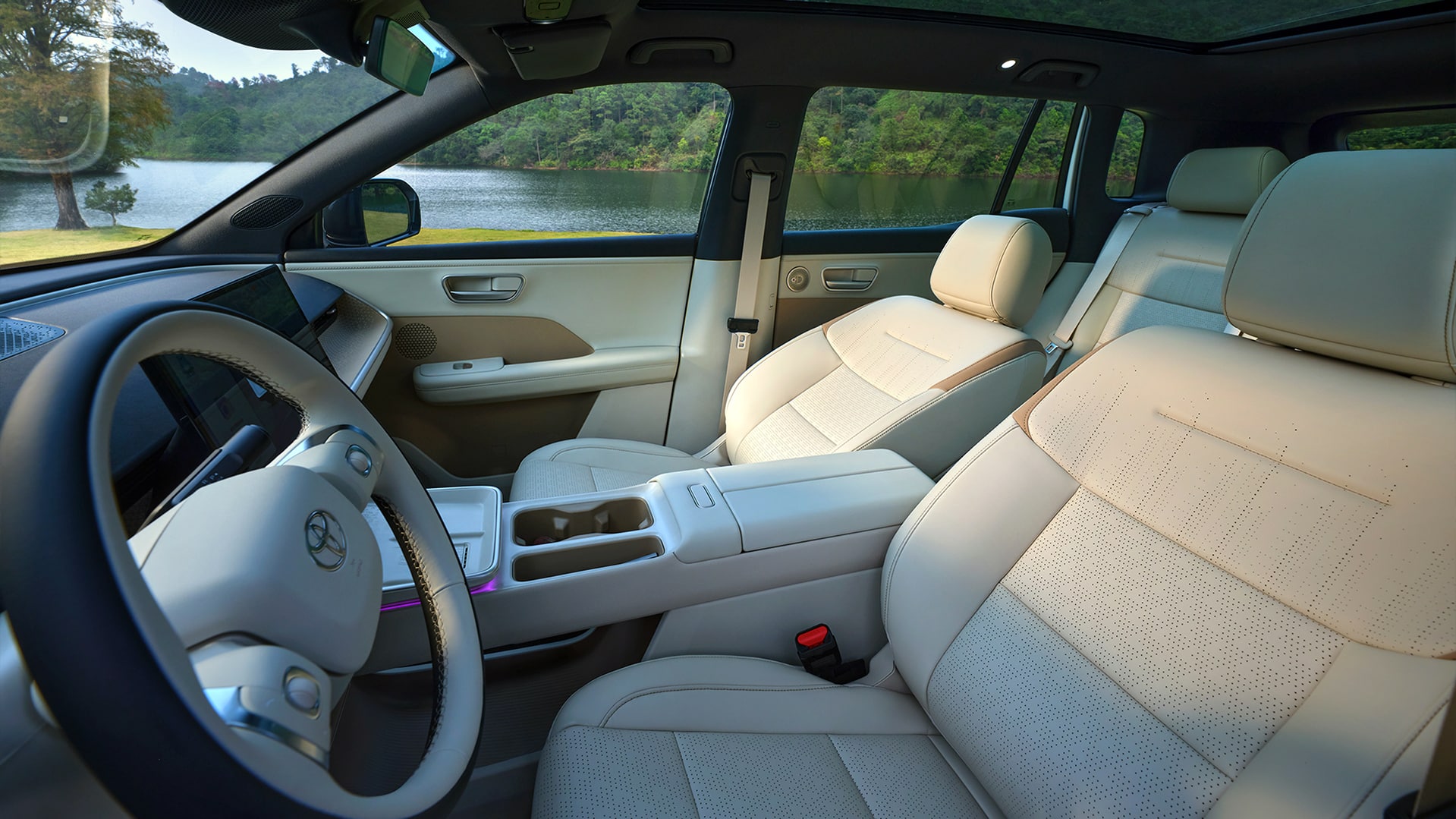 Az új villany-Toyota alapfelszereltségként 14,6 colos infotainment-kijelzőt (villámgyors Qualcomm Snapdragon 8155 chip hajtja a fedélzeti rendszert) és 8,8 colos digitális műszeregységet is tartalmaz. Emellett kétküllős bőrkormány, vezeték nélküli telefontöltő, lebegő, kétszintes középkonzol és 11 hangszórós Yamaha audiorendszer is jár hozzá, a jobban felszerelt változatokban pedig fejlett hangvezérlés, körkörös kamerarendszer, 1,14 m2-es panoráma-napfénytető, bőrkárpit, első-hátsó ülésfűtés/szellőzés és ággyá alakítható első ülések is lesznek, utóbbiakkal két darab három méter hosszú fekvő felület alakítható ki.