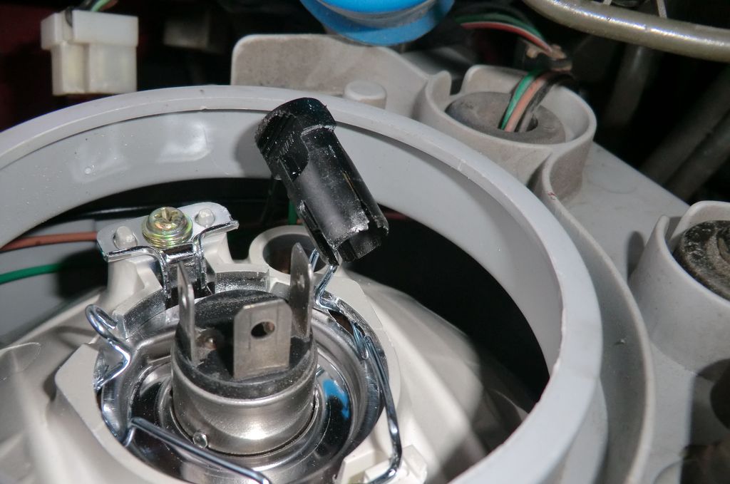 Helyzetjelző izzó cseréje a Chevrolet Sparkban. Első lépés: szerelje ki a fényszórót! Utána egy határozott mozdulattal vagy némi tekergetéssel kihúzható a foglalat, melybe gond nélkül tolható a megfelelő talpú LED