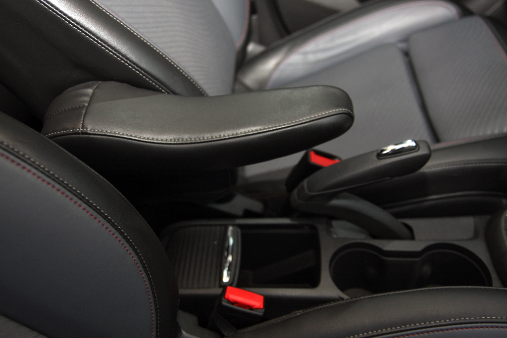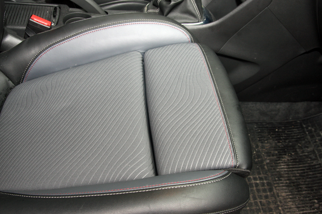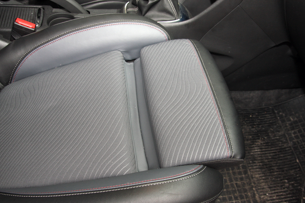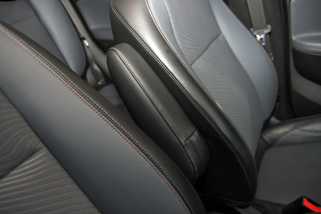 Az összeszerelés, a minőség szemre-szagra-tapintásra rendben van – ha nem is kimagasló, de jó. Hangulatjavító persze a nem kevés krómszerű, illetve szálcsiszolt aludísz, sötétben a vöröses derengés, és még inkább az a félbőrös kárpit a piros és fehér cérnás varrással. Hosszabb távokon lehajtható karfa teszi kényelmesebbé az utazást. Ám csak a sofőrnek. Aki a jobbján ül, ne könyökölgessen, na. A mélységében is állítható kormány fogása remek, téli hidegben meg istenes, hogy pillanatok alatt meleg is bír lenni. Mivel fűthető, akárcsak az első ülések.