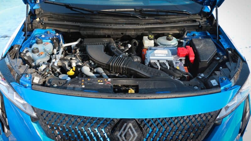 Most, hogy alaposan kiveséztük a belső teret, nézzük mi lapul a Rafale orrában. A tesztpéldány a 200 lóerős full hibrid hajtásláncot kapta. Ennek szívét 3 hengeres, 1,2 literes benzines erőforrás adja 130 lóerővel. Ehhez társul a 68 lovas villanymotor, a kettő együtt 205 newtonméternyi nyomaték leadására képes 1750-es fordulaton. A konfigurációt egy 2 kilowattórás akkumulátor teszi teljessé.