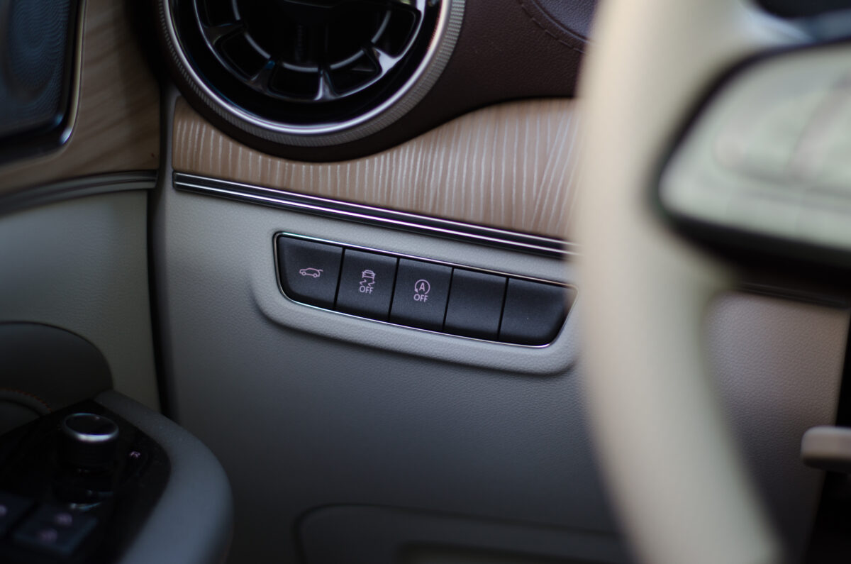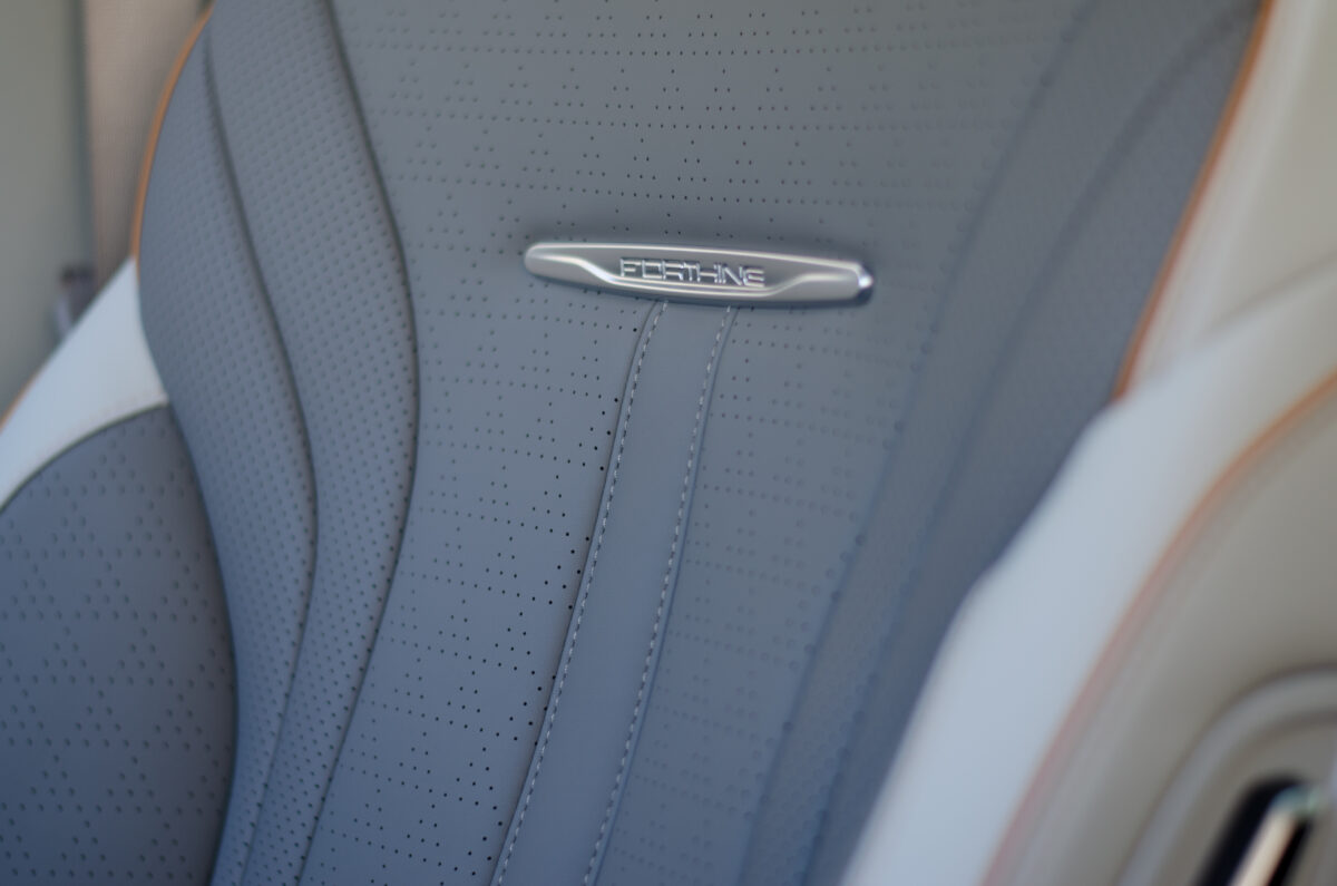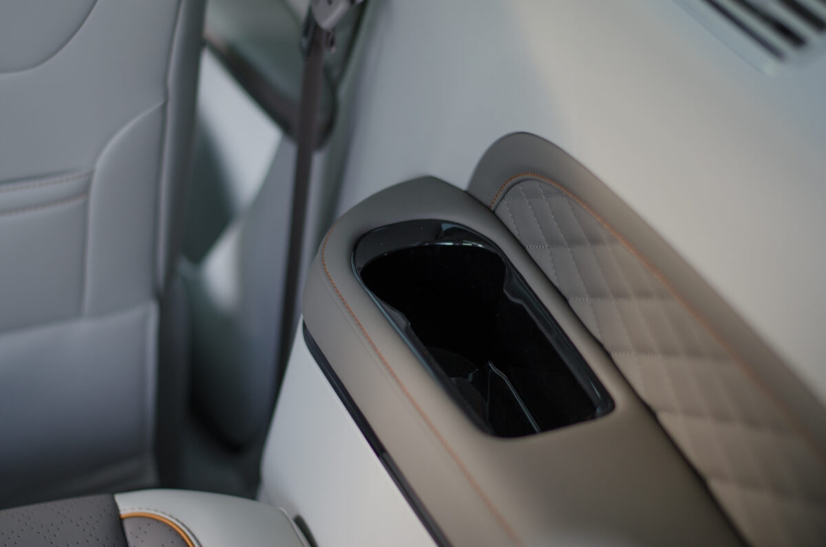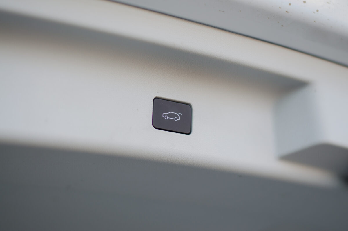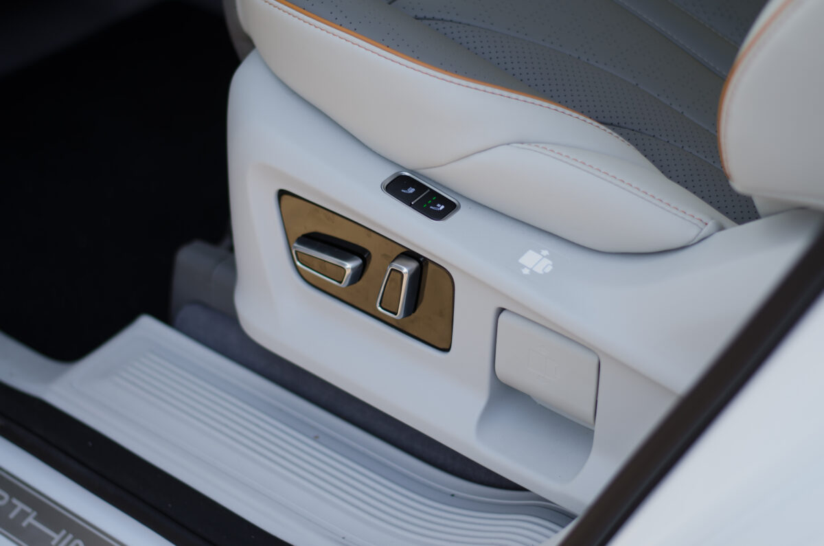 "telefontartó-tartó" is ott virít a két középső szellőző között. Ebben a tesztautóban valódi képernyőt kaptunk műszeregység gyanánt is, mindkét képernyő 10,25 colos. Aztán általában a nézelődőknek gyorsan feltűnik még a hatalmas, nyitható tetőablak, a fűthető-szellőztethető, illetve masszázsfunkciós ülés, és az itthon különleges utastér-elrendezés.