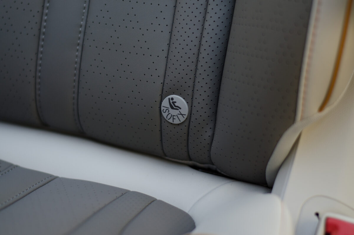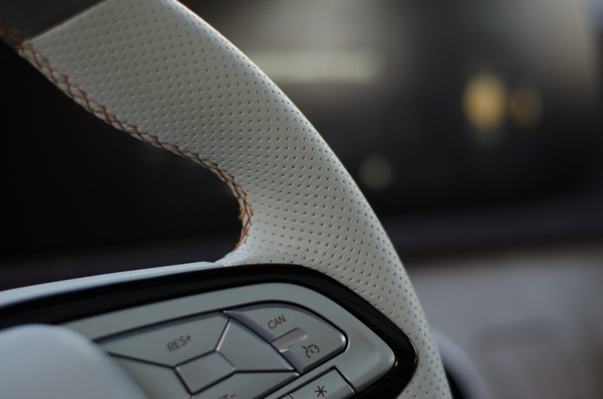 Gyönyörű ez a beltér. De viszont a célközönséget 100% eltántorítja a vásárlástól – mindig lesz olyan lurkó akinél még ott van a nadrágzsebben egy megolvadt Kinder csokoládé és nekiáll elmajszolgatni a szép fehér ülésen. A sok szteppelést meg lyuggatást én kihagynám, emberszállító autóba valami egyszerűbben takarítható felület dukál.