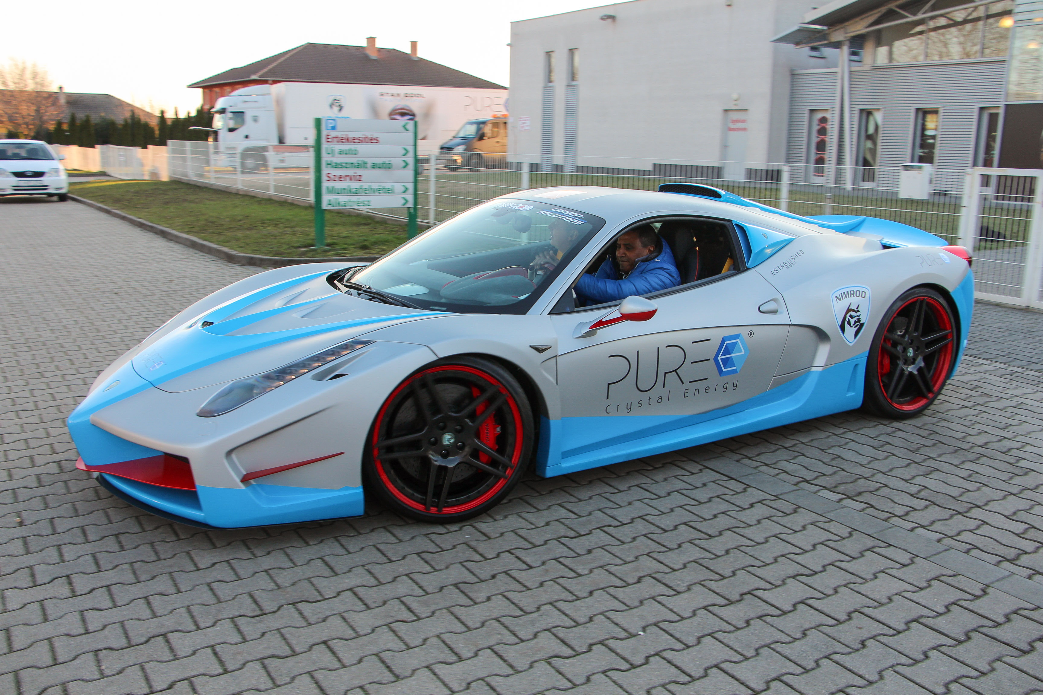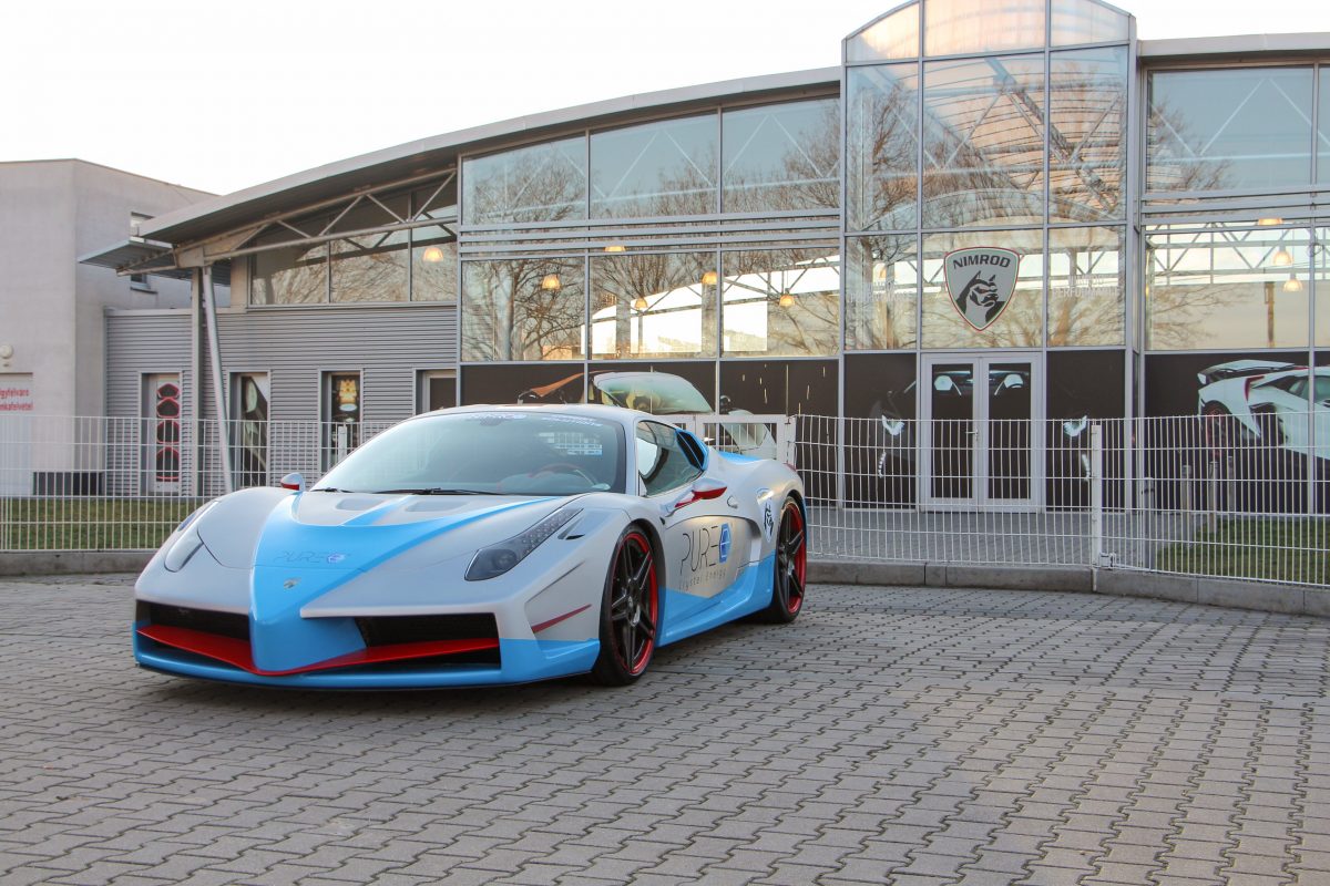 Míg a drágább Lamborghini Aventadorból immár második ruháját ölti a Nimrod, bocsánat Nimrod Performance példánya, a Ferrarik "futószalagon" készülnek Dunaújvárosban. Látogatásunkkor is három példány volt a műhelynél, ami egyébként a hazai gazdaság szebb napjaiban egy Skoda autószalon volt. Most pedig ott állt előtte is egy átépített 458 Italia, kettő épül-szépült a garázsban, az egyikét, színváltós matt kék fényezésével fóliájával még meg is tudtuk fotózni. Egy korábbi példánnyal pedig egy élménykör is jutott. A "kis" 4,5 literes V8-as 570-590 lóereje sem szerény ám, a váltó itt is hétfokozatú robotizált, akárcsak az Aventadornál, ám itt duplakuplungos. Villámgyorsan kapcsol, hajtás csak hátul (az Aventador ugyebár összkerekes), a 100 km/órás sprint itt ugyan 3,4 másodpercig is eltart, de így is elképesztően gyors. Bevallom, lehetséges, hogy az engedélyezett tempót is túlléphettük Dunaújváros határában, de a Ferrari kilométeróráját az utas nem látja. Csak az utat, ami gyorsan suhan, kanyarban tapad az autó, a vigyor pedig húzódik az arcokon. Aztán Bader úr beböffenti, hogy egy ilyen "olcsó" Ferrari gyárilag 280 ezer eurótól elérhető, ő sem adja drágábban, mint 350-400 ezer euró. Fele annyiba kerül tehát, mint az Aventador, az élmény viszont itt is nagyon-nagyon komoly.