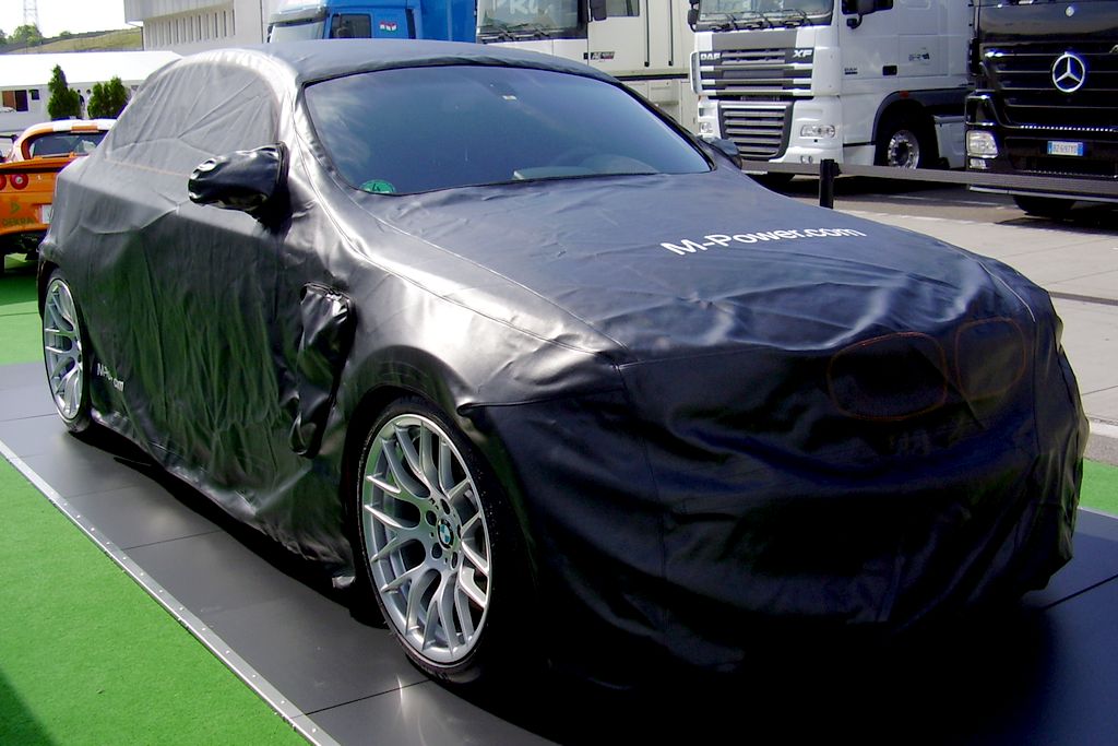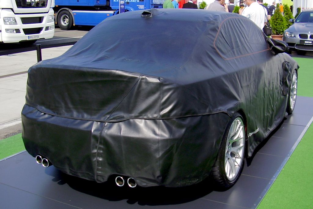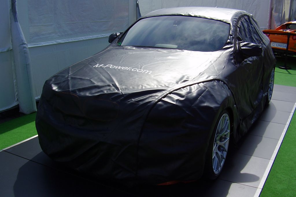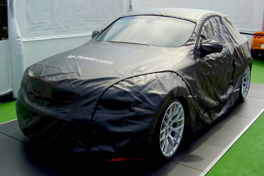 Bőrbe kötött BMW. Az 1 M Coupe ugyanolyan álcával várta a sajtótájékoztató utáni kicsomagolást, mint azt néhány hónapja az első képeken láthattuk. Még a takaró is stílusos, az ablakkeretek és a vesék helyét narancsszínű cérnával varrták, és külön kis zsák jutott az M3 ihletésű tükröknek, de még a cápauszony tetőantennának is