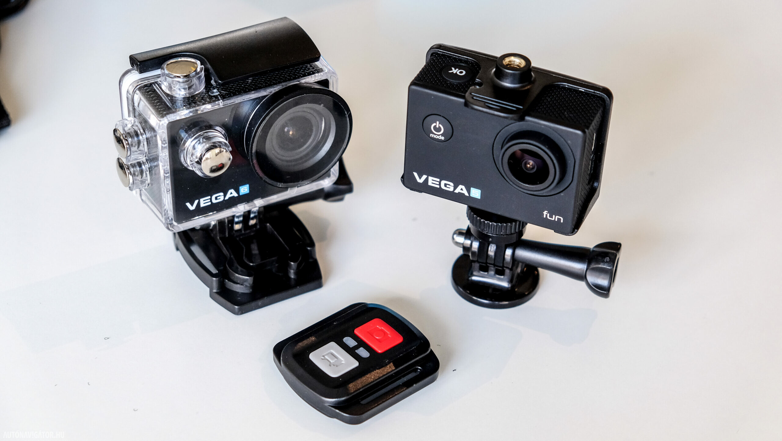 Érintőkijelző nincs, csak egy 2 colos kis monitor a hátulján, de legalább van, ez a kép beállításához elég fontos. Okostelefonos alkalmazáson keresztül is irányítható mindkét kamera. Ennek legnagyobb előnye, hogy a képet élőben látjuk a telefonunk kijelzőjén, így a pozicionálás sokkal egyszerűbb. A telefon wifin keresztül kapcsolódik a kamerához és a kép egészen gyorsan át is megy a telefonra, beállításokat nem végezhetünk, de a használatot nagyon leegyszerűsíti. Van hozzá távirányító, amivel elindíthatjuk a felvételt és leállíthatjuk, valamint fotózhatunk, ez egész jól működött. Mindkét kamerán négy gomb található, az oldalsó kettővel navigálhatunk a menükben. Ezen a téren nagyon különböző a két készülék, furcsa módon a Vega 5 kezelhetősége és reakcióideje a jobb, miközben teljesítményben a Vega 6 a komolyabb, és árban is. Míg előbbi 19 990 forint, utóbbi 34 990, vagyis a differencia árban jelentős, annak ellenére, hogy elsőre nem is feltétlenül vennénk észre a különbséget.