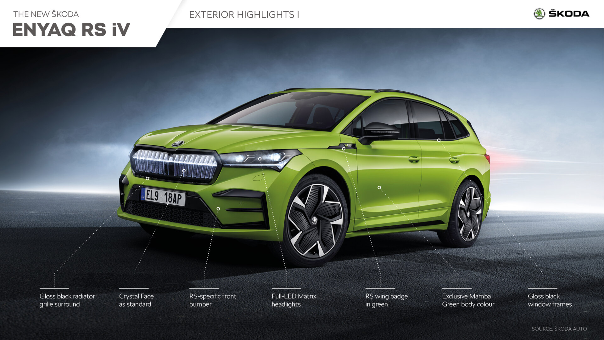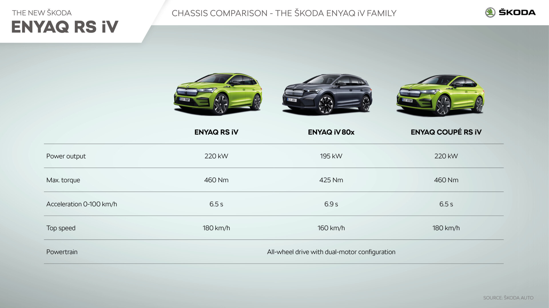 Két villanymotorral és 220 kilowattos, azaz közel 300 lóerős teljesítménnyel bővül a csehek népszerű elektromos modelljének számító Enyaq iV kínálata a kupéváltozat már ismert RS verzióját adaptálva. Az összkerékmeghajtással érkező modell a kínálat legtetejére érkezik, ez lesz a villany-SUV csúcsváltozata, egyben a kupéval együtt a csehek valaha volt legerősebb sorozatgyártott autója. A 82 kWh kapacitású akkucsomaggal és a 0,265-ös alaktényezővel akár 500 kilométer feletti hatótávolságra is képes lehet egyetlen töltéssel a WLTP mérési ciklus szerint.