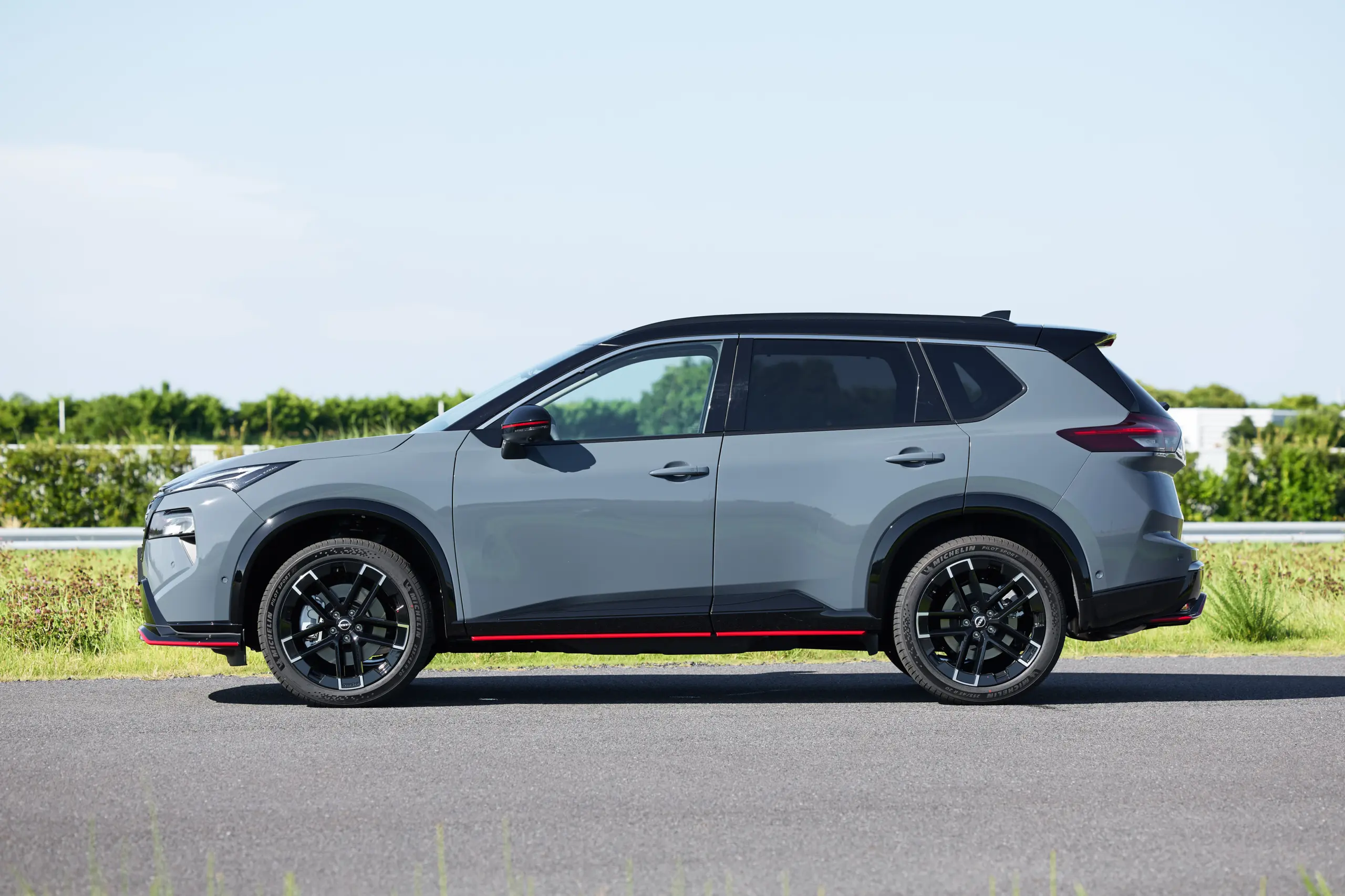 Javarészt az Ariya esetében is látottt módszert választotta a Nissan az X-Trail tuningolására is. Elöl-hátul sportosabb lökhárítókat helyeztek a SUV alá, a két elemet pedig a küszöbéleken is végigfutó piros díszcsík köti össze. Ugyancsak közös pont az autó elején és hátulján a Nismo felirat.