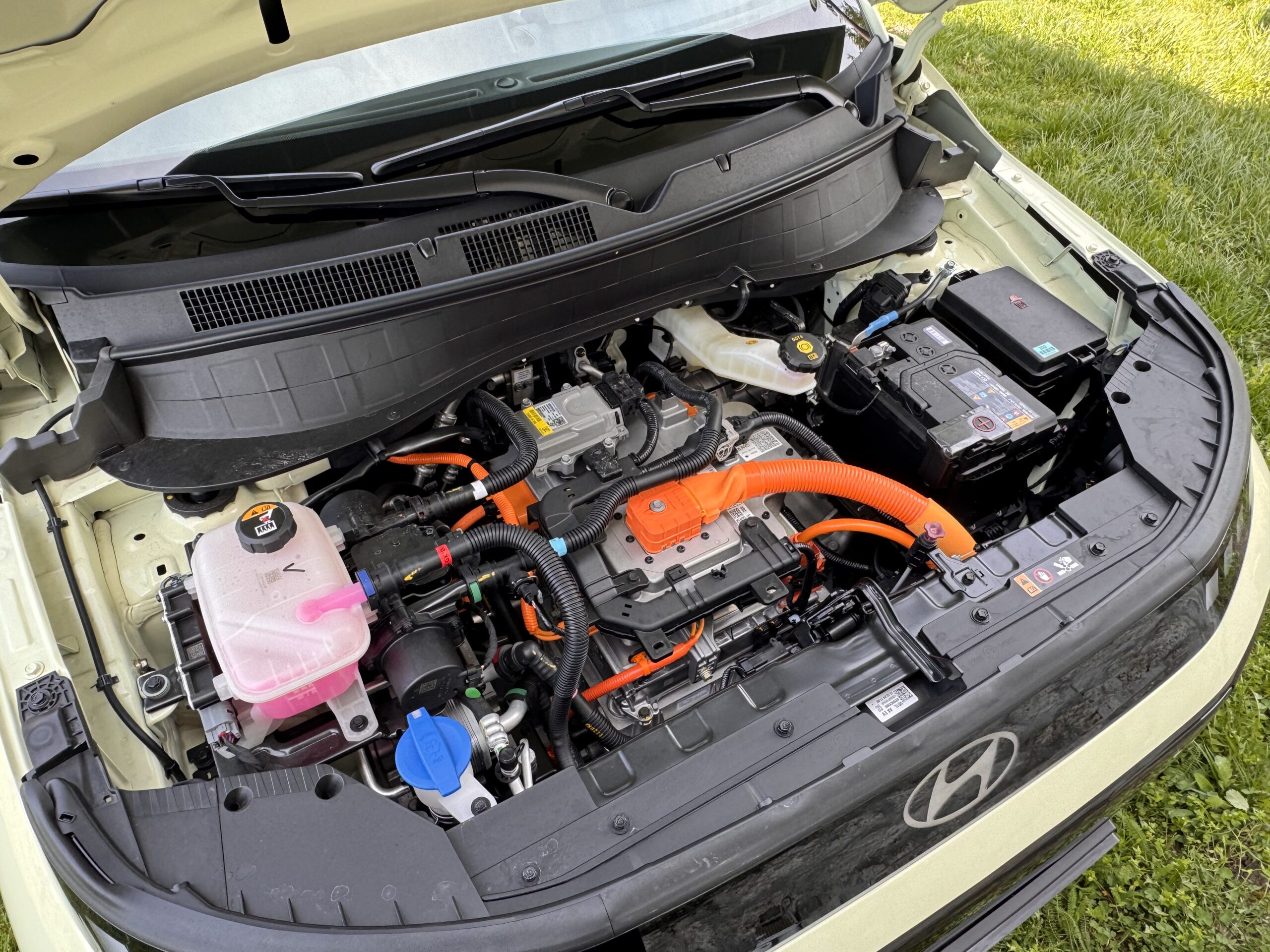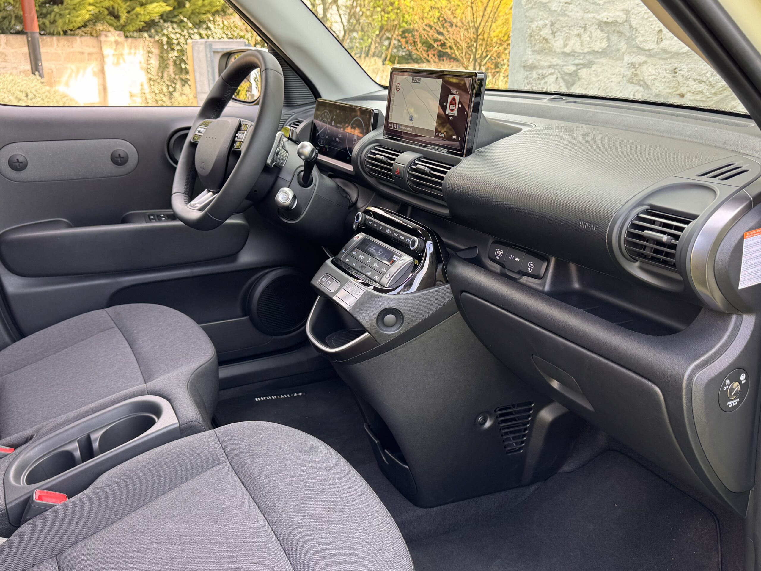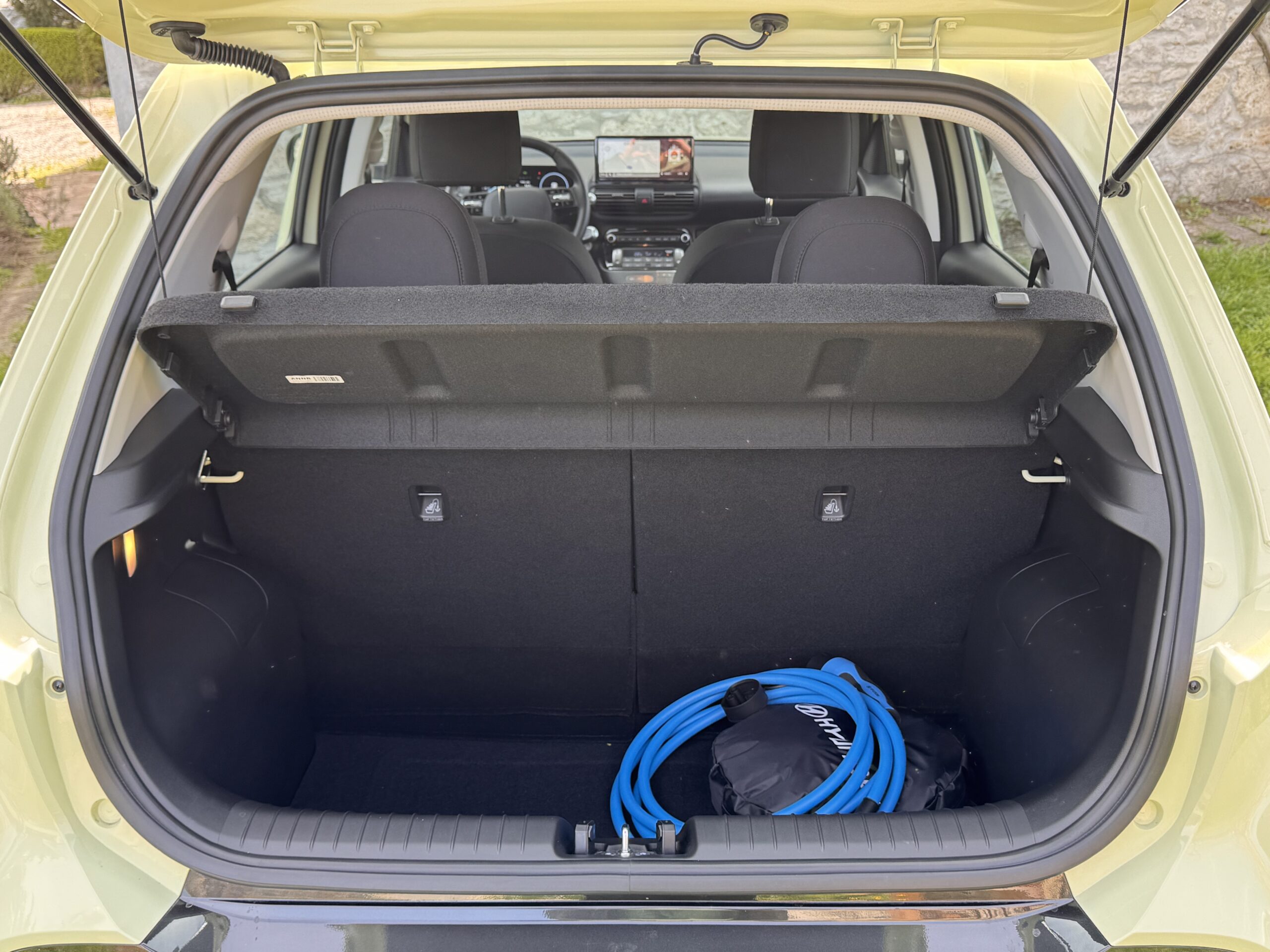 Mindjárt rátérek arra is, hogy mi mozgatja az autót, de előtte gyorsan kicsit a belsőről: Elöl a keskenység jól érezhető, szinte épphogy elfértem a vezetőülésben, ugyanakkor nem szabad elfelejteni , hogy egy miniautó nem a hosszú utazásokról szól. Tehát, ha városi rohangálós autóként tekintek rá, amibe ki-be ugrál a sofőr rövid utak megtétele után, akkor elviselhető. Főleg, hogy az ülés kényelmes, a megfelelő vezetési pozíció gyorsan megtalálható és a műszerfal ergonómiájára sem lehet panasz. A vezető előtt 10,25 colos digitális műszeregységről olvashatók le az infók, a középkonzolon pedig ugyancsak 10,25 colos infotainment kijelző található. Akad még vezeték nélküli telefontölté és USB-csatlakozók is, ahogy az manapság elvárható. A kormány vastagsága, fogása jó, és még olyan apróságokra is gondoltak, mint a kis akasztófülek, illetve az ajtóburkolatok cserélhető díszbetétje. Hátul két felnőtt is elfér, de velük sem érdemes hosszú útra indulni, már csak azért sem, mert az alaphelyzetben 238 literes csomagtérben nem fog mindenkinek a cucca elférni. Ugyanakkor a hátsó ülések ledöntésével 1059 literes tér is kialakítható.