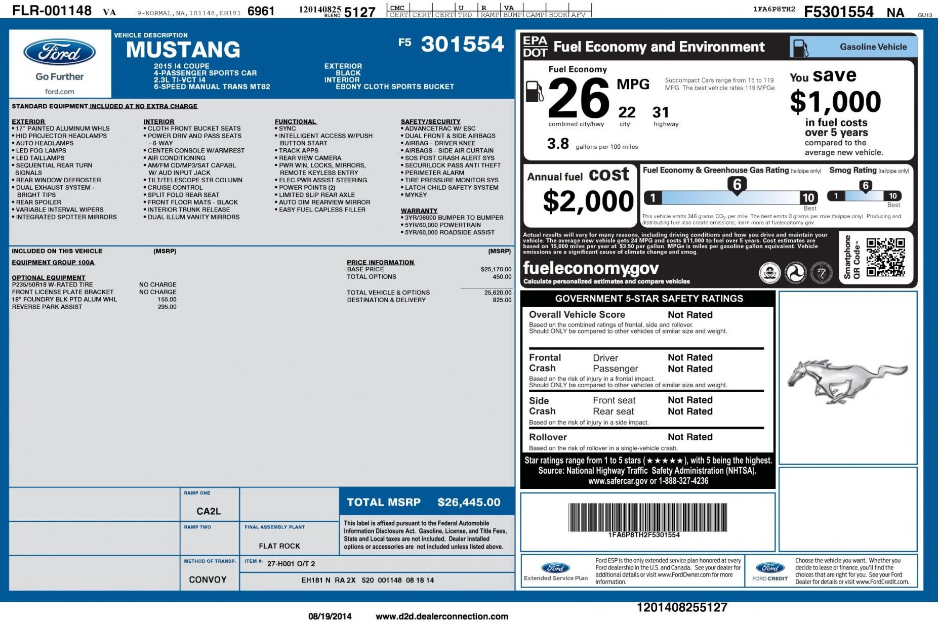 Az állítólagos kiszivárgott dokumentumok szerint a Mustang új négyhengerese kézi váltóval 9 litert kér majd vegyesben, míg városban 10,7-et, országúton meg 7,6-ot. Ezek az értékek nem rosszak, de az Amerikában alap V6-os fogyasztása romlott: 13,9 városban és 8,5 országúton a bűvös érték. Automatával a V6-os jobb városban, azzal "csak" 12,4 litert kér. Összevetve a korábbi Mustanggal, abból a V6-os automata országúton 8 decivel kevesebbet kért, a Chevrolet Camaro viszont ugyanennyi benzinnel megy el.