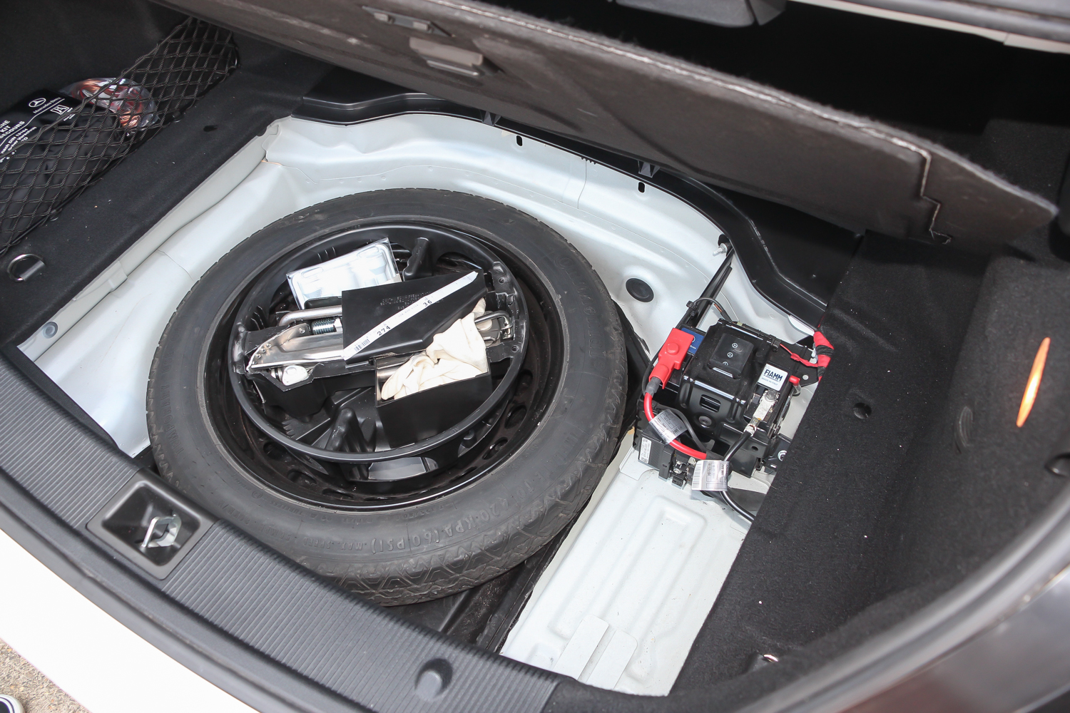Normális méretű csomagtér, alatta mankókerékkel és egy kis aksival. A padlólap ilyenformán történő felakasztása a Mercedesnél évtizedes hagyomány. Praktikum egy ötforintos műanyagrabbal