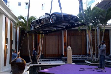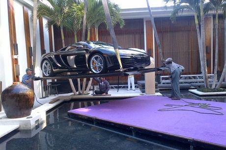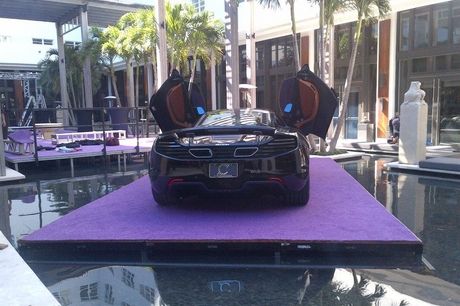 A McLarent daruval emelték a parti helyszínéül szolgáló szálloda medencéjébe rittyentett emelvényre (fotó: tmz.com)