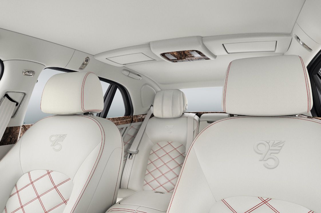 A beltérben a 95. szülinapra emlékeztető logók mindenhol, az üléseken számmal, a küszöbökön betűkkel kiírva. A Mulsanne 95 diófabetétei sem akármilyenek, a nemesfa egy több évszázados példányát egy 2007-es vihar csavarta ki. 300 és 400 év közi teszik a Fulbeck Hallban nőtt ősfa korát. A Bentley szerint a konkrét fa mély, fodros mintázata teljesen egyedi. Ahogy a kék és vajszínű bőrborítás a díszítővarrásokkal, úgy ez is emeli a kabin exkluzivitását. Az évfordulós kivitel csak az Egyesült Királyság országaiban rendelhető, és mindössze 15 példányt készítenek belőle.