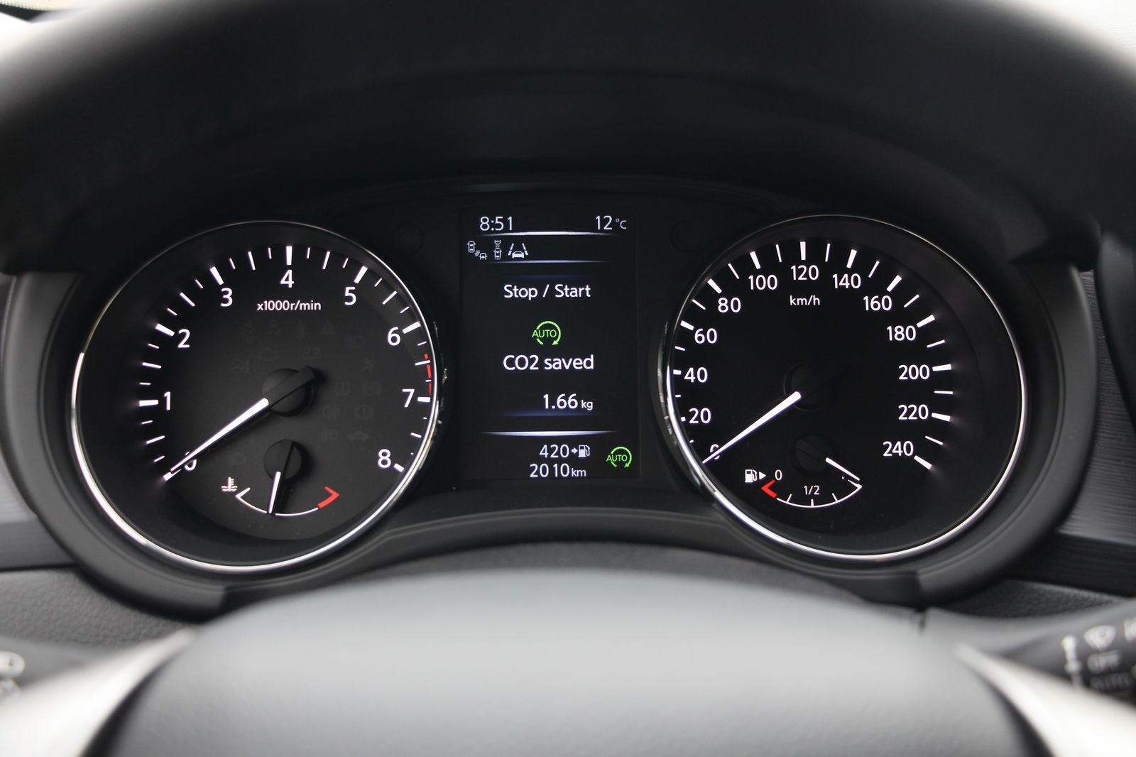 A navigáció nemcsak a középkonzoli, akár tolató- illetve, előre és oldalra, vagy akár a padkát is látó kamerát is megjelenítő érintőképernyőn, hanem a műszerek között is jöhet, ugyanott a stop-start által megspórolt CO2 is látható