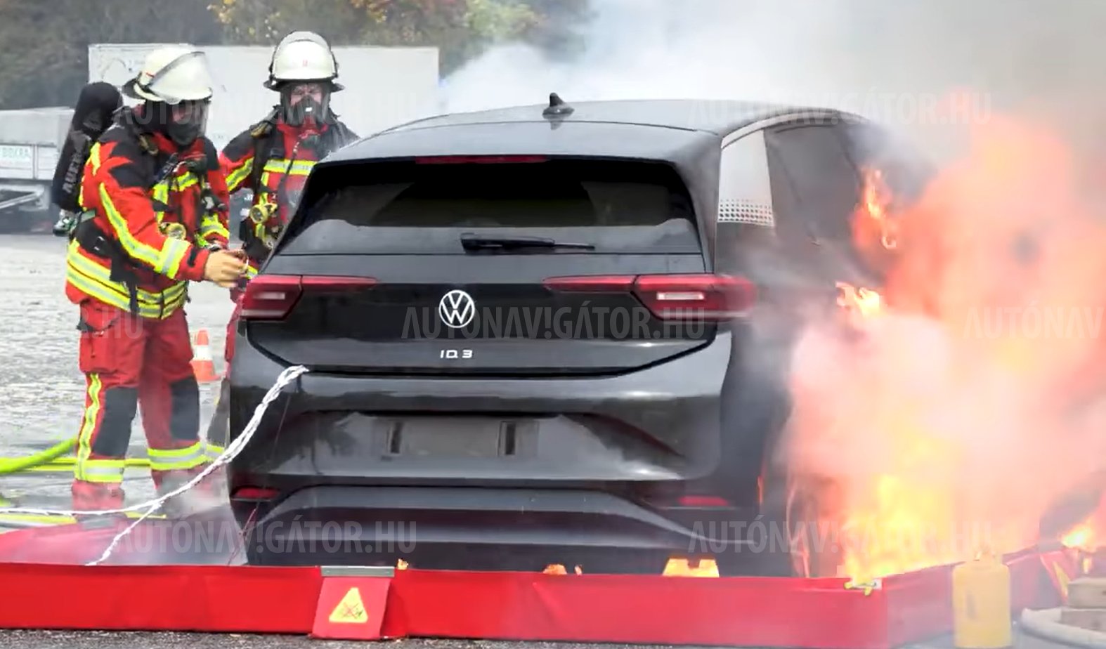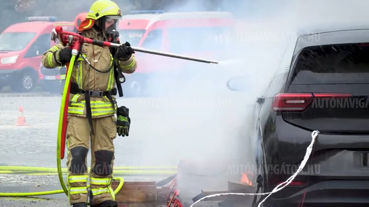 A villanyautó-tüzek oltása kiemelten nehéz feladat, főleg forgalmas útszakaszok mentén, vagy településen belül (Fotó: Facebook.com/MKIF Zrt.)