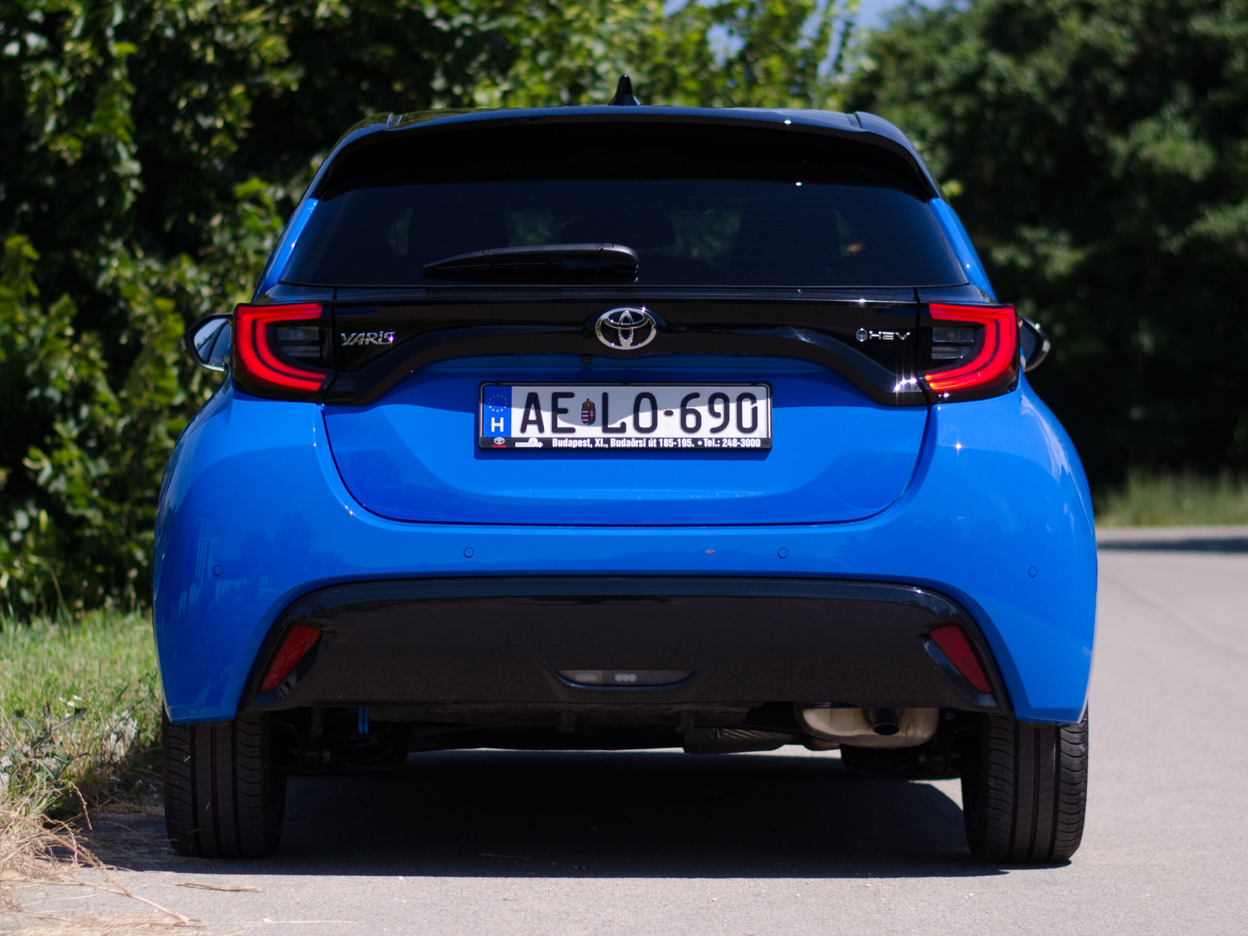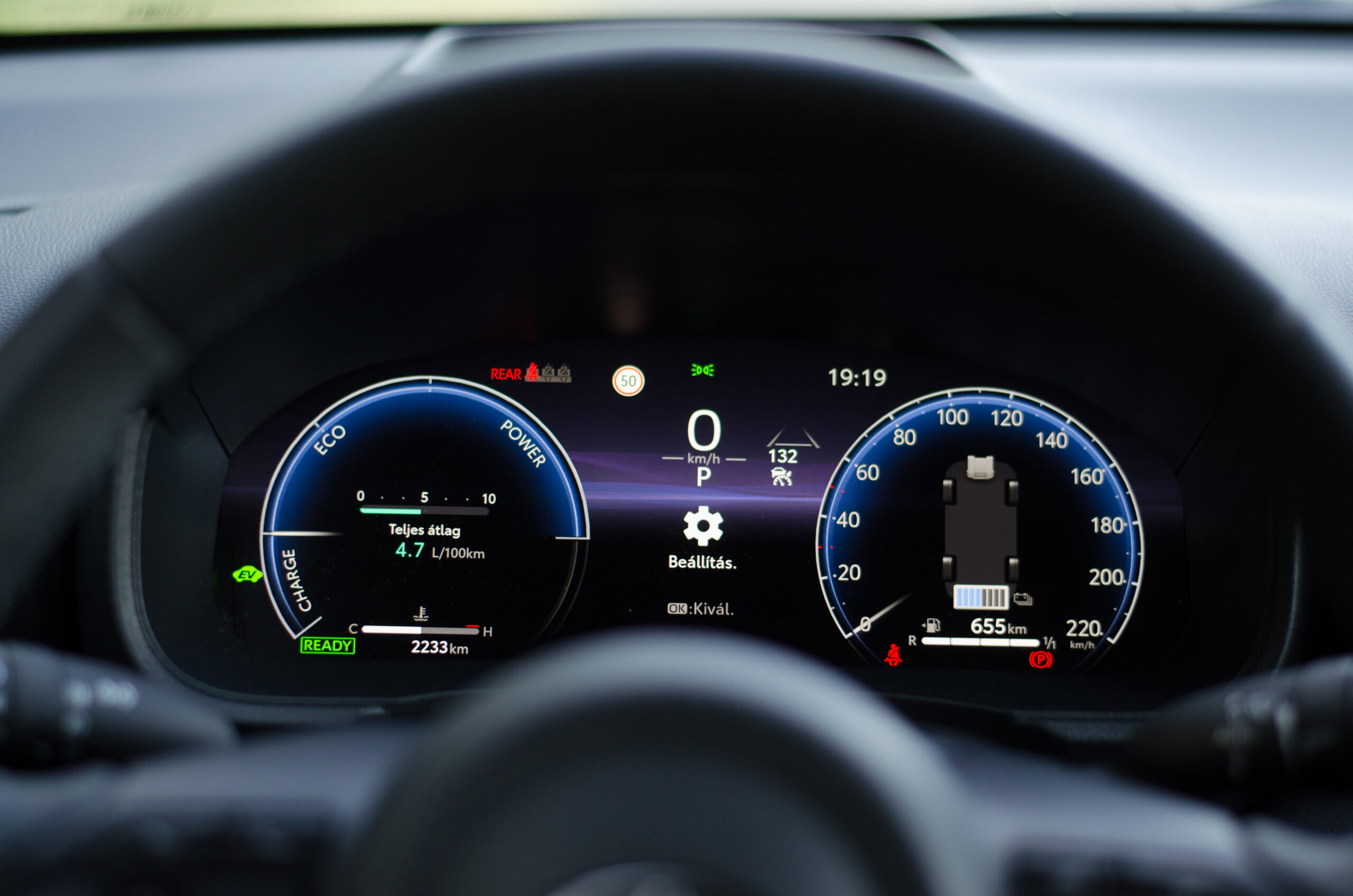 Ahhoz azonban inkább az autó másik végén kell keresgélni, hogy a legkomolyabb újdonságot is megtaláljuk a friss Yarisban, ez pedig nem más, mint a két hibrid hajtáslánc-opció. A kevesek által kedvelt, elektromos rásegítés nélküli 1,0 literes háromhengeres ment a levesbe, ráadásul hibridből is csak két opció maradt az 1,5 literes, készletről elérhető alapmotor mellé. Mindkettő a legújabb, ötödik generációs hajtáslánc-technológiával dolgozik. A gyengébbik, 116 lóerős opció is bőven elég erős egy ekkora autóba, ám ezt a konkrét tesztautót a 130 lóerős csúcsváltozattal szerelték.