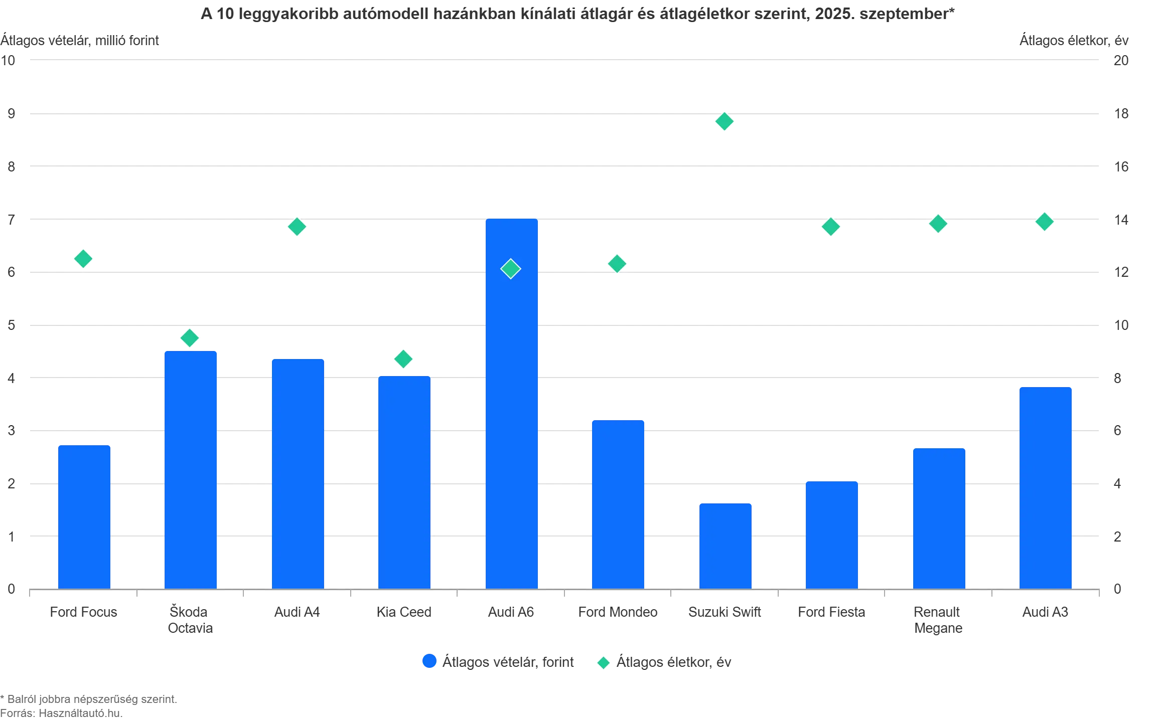 Szeptemberben a legtöbb hirdetés a Volkswagenhez kapcsolódott, több mint 7000 használt Volkswagent hirdettek a platformon. Ezt követte a 6400 BMW, majd a Ford és az Opel, mindkettÅ‘ 6000 körüli értékekkel. A tÃzes lista végén a Kia állt, mintegy 2500 hirdetéssel. A legfiatalabb autók a Kia modelljei voltak (átlagosan 10 évesek), mÃg a Renault, Opel és Volkswagen modellek 12,7–13,8 éves átlagéletkort mutattak. A prémium szegmens (Mercedes, BMW, Audi) hirdetései továbbra is kiemelkedÅ‘ átlagárral szerepeltek, mÃg az Opel és Renault modellek kÃnálati ára jellemzÅ‘en 3 millió forint alatt mozgott. A tÃz leggyakrabban hirdetett modell közül a Ford Focus és a Å koda Octavia Å‘rzi elsÅ‘ két helyét. Az Audi A6 modell átlagára volt a legmagasabb (7 millió forint), mÃg a Suzuki Swift a legolcsóbb (1,6 millió forint). Életkor alapján a Kia Ceed volt a legfiatalabb (8,7 év), a Suzuki Swift pedig a legidÅ‘sebb (17,7 év).