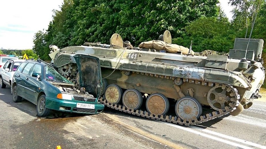 A harcjárművek sorban kanyarodnak ki a főútra, ahol megállították a forgalmat, hogy senki ne keresztezze a menetoszlop útját. Több lánctalpas gond nélkül elhalad a kocsisor mellett, majd az egyik, vélhetően a túl nagy gáznak köszönhetően kanyarodás közben kisodródik. Félig eltaposta a sor elején álló Polo kombit, amiben egy idősebb férfi és unokája ült. Karcolásokkal megúszták, ám mindketten alaposan megrémültek, ami teljesen érthető. Kárukat állítólag a hadsereg már magára vállalata, így ki fogják fizetni az összetört autót.