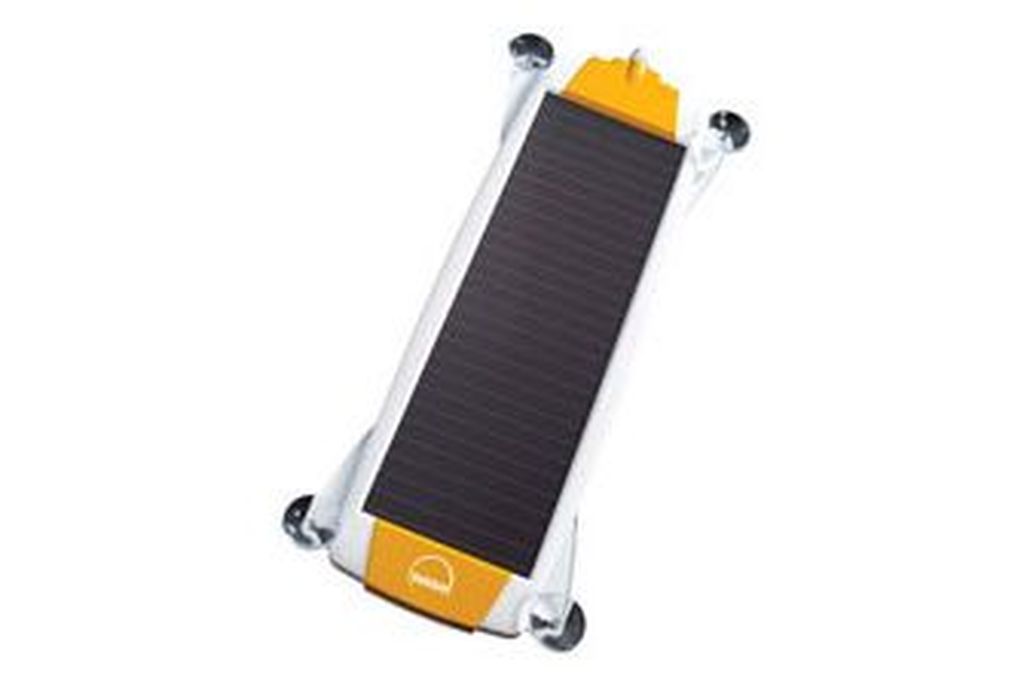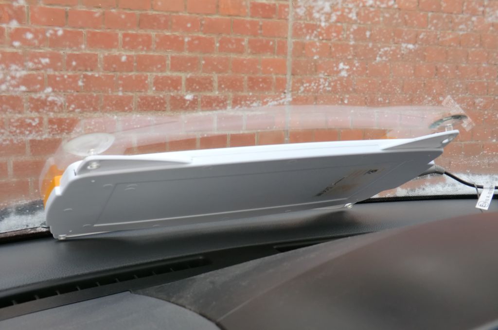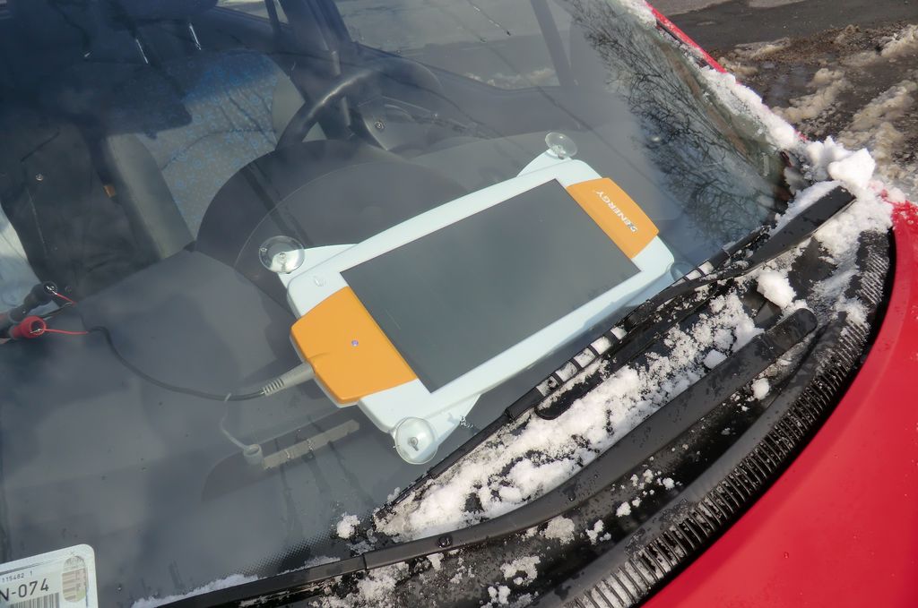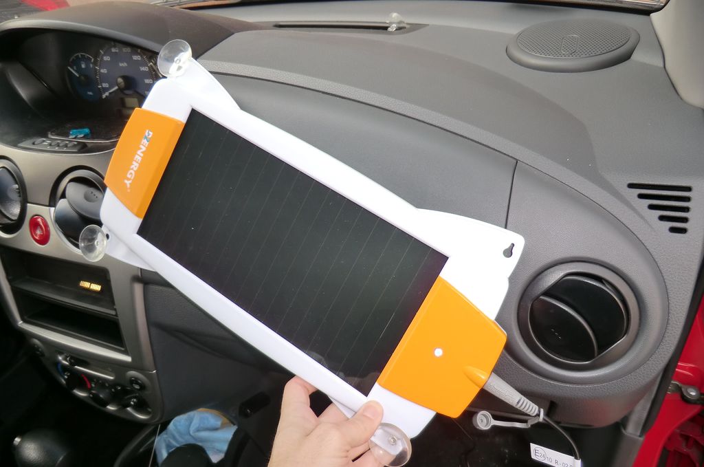 Így néz ki az akkumulátor csepptöltésére fogható napelem. 40 cm-es széltével és 18 cm-es magasságával még akár állandóan is a szélvédő tövében hagyható