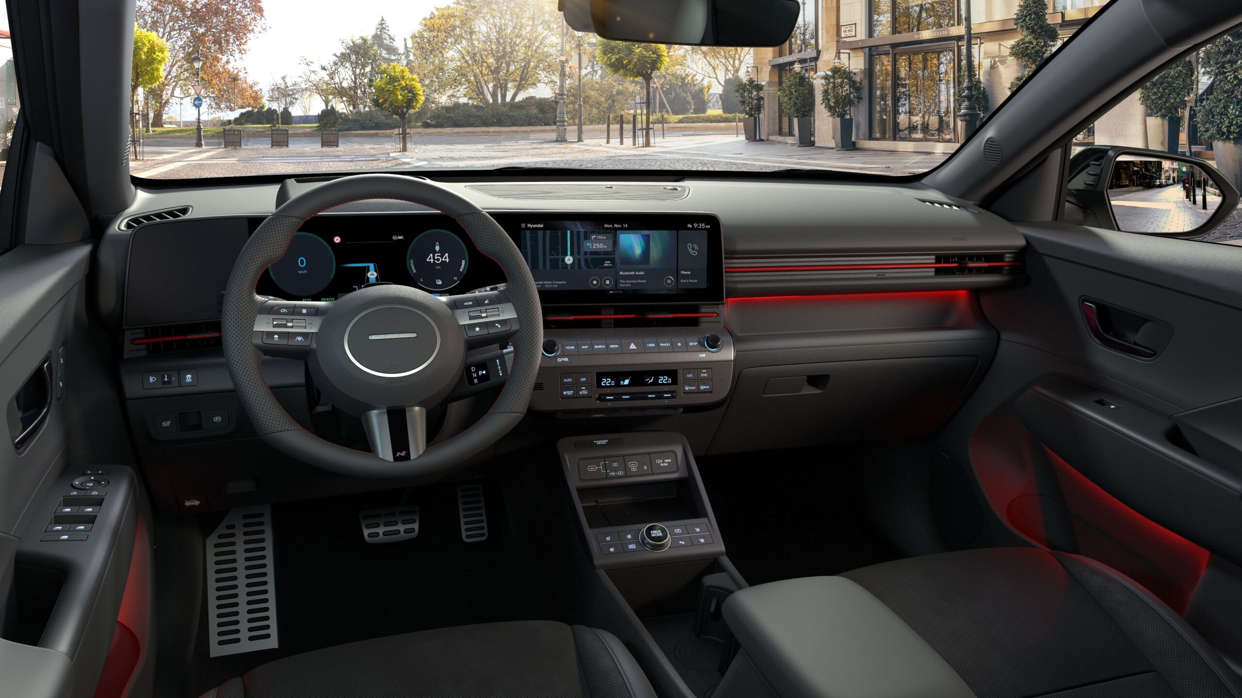 Odabent is találhatunk majd újdonságokat, például az N Line kormánykereket és a fém pedálokat. A tetőkárpit színe fekete, illetve sportos N Line ülések járnak az extra felszereltséghez, melyek piros kontrasztvarrást kapnak, valamint fűthetők és hűthetők. További érdekesség, hogy a csomag részeként választható szövet, illetve bőr és Alcantara párosával az ülések huzata, az Alcantara ráadásul 57%-ban újrahasznosított poliészterből készül. Az opciós listára felkerült még a 7+1 hangszórós BOSE hangrendszer és egy sor vezetéssegítő és biztonságtechnikai asszisztens, köztük a továbbfejlesztett vészfékező rendszer, ami a kereszteződésbe érve az oldalról jövő forgalomra is figyel. Az N Line felszereltségű Kona Electricek heteken belül gyártásba kerülnek, a csomag pontos tételeiről tehát hamarosan lehet érdeklődni a kereskedőknél.