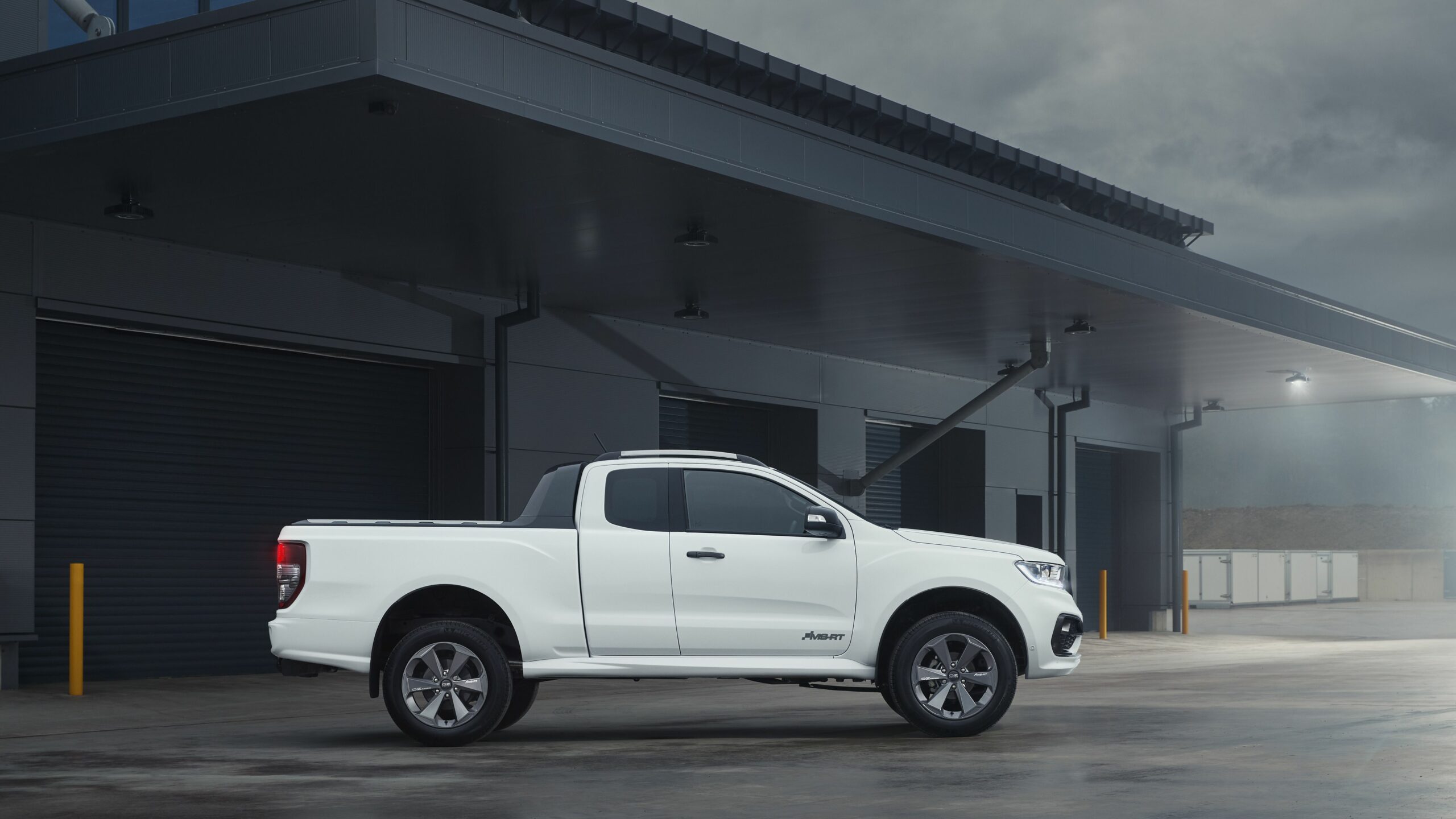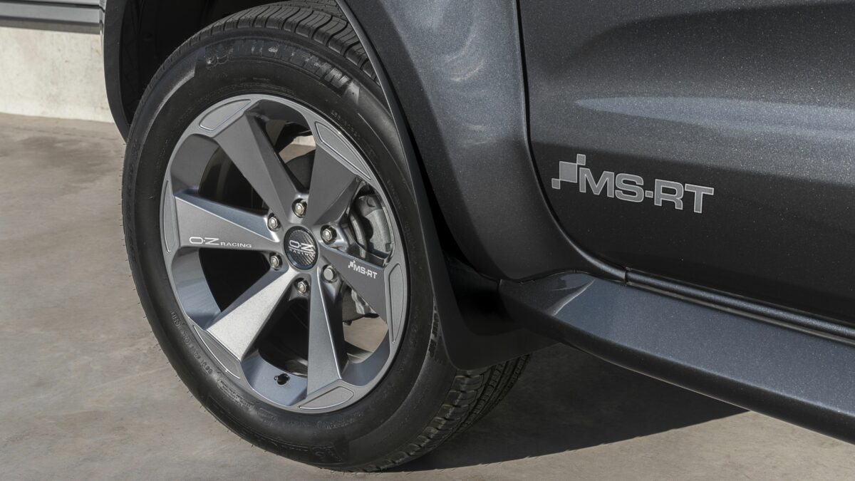 Új a nagy légbeömlős orr, a hűtőmaszk itt természetesen méhsejt-mintás és szénszálas hatású. Az oldalnézetet a szélesített sárvédők határozzák meg, alájuk 20 colos OZ Racing alufelnik kerülnek, a fényezés csakis fehér, szürke vagy fekete lehet, bukócső és néhány MS-RT embléma alapáron jár.A 2,0 literes biturbó dízel 500 Nm nyomatékával valóban sportossá teszi a pickupok között