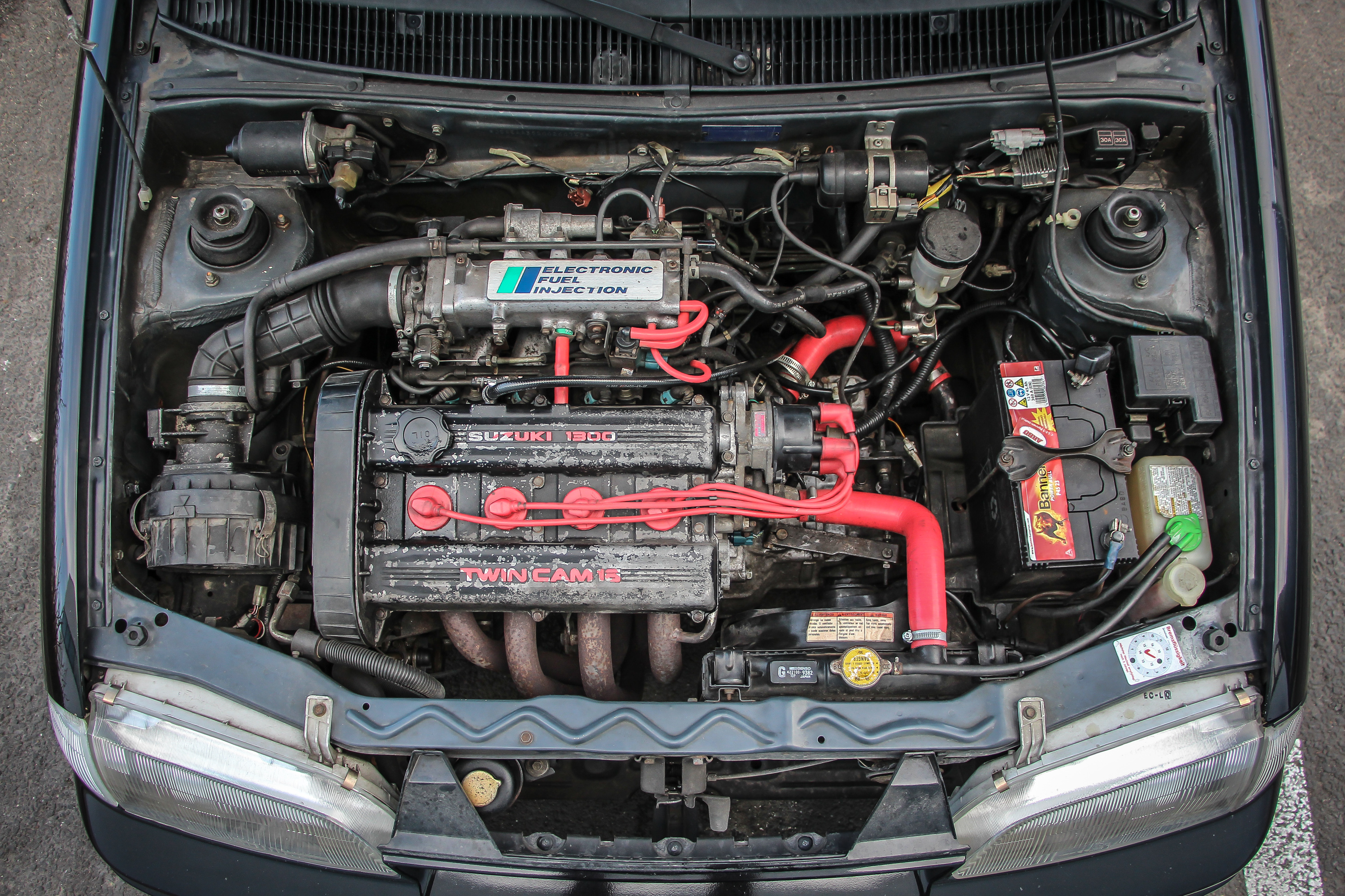 Tudjuk, mekkora egy Swift, de így, csöppet még ültetve is, még apróbbnak tűnik, és épp ezért borzalmasan jó szórakozást nyújt. A karosszéria teljesen megegyezik a hagyományos Swiftével, tévhit, hogy bármivel is erősebb lenne, ezért a javítása sem horror összeg. Rohadási hajlama sincs másként, ennek itt javításra szorulnak az első sárvédői és a jobb hátsó, viszont alulról makulátlan, és ez nem csak szóbeszéd. Bent teljesen más, mint ahogy ismerjük, szembetűnőek a sportülések, amik oldaltartása a kornak megfelelő, mai szemmel pedig teljesen átlagos, ám két ilyen makulátlan állapotú első GTi sportülés ma aranyat ér, már csak azért is ritka, mert csak az utolsó szériásak kaptak ilyet. Más az ajtókárpit, a műszerfal, a kormány, mint a hagyományos modellben, itt pedig külön érdekes a ’90-es évek stílusában színesre pingált szőnyeggarnitúra, szintén közel gyári állapotban. A műszerfalon egyetlen sérülést találni csak, vélhetően egy korábbi telefontartó nyomát, mivel a kor kedvenc kiegészítője nem maradhatott ki az autóból. Egyébként személyes kedvencem a könyöklő, ami apró, de pont elég érdekes és különleges alkatrész, egy mai autóból átülve pedig egészen egyértelmű, hogy annak ott helye van.