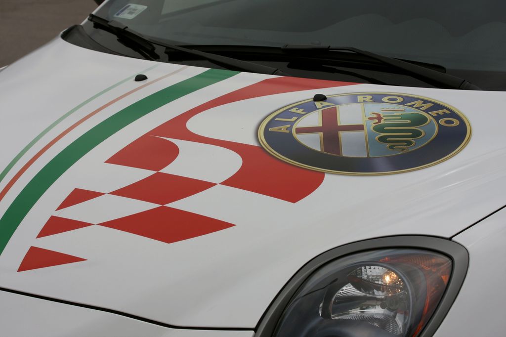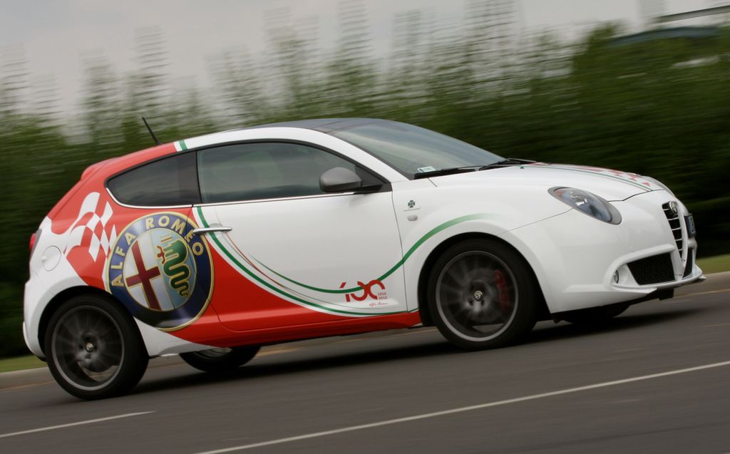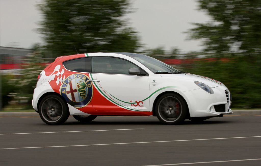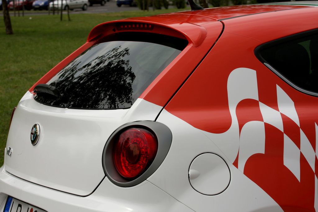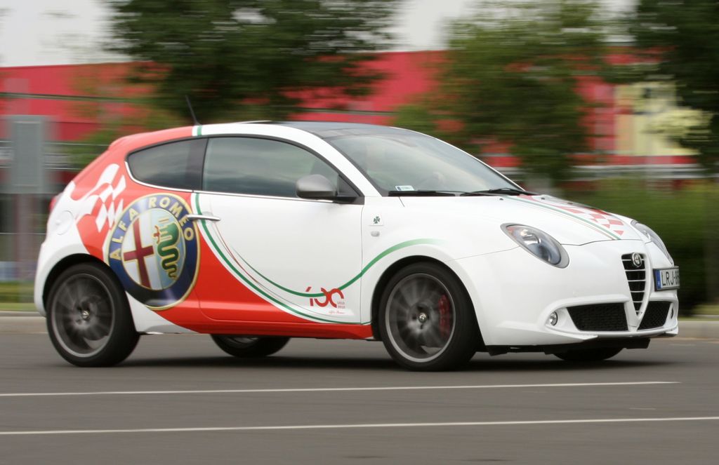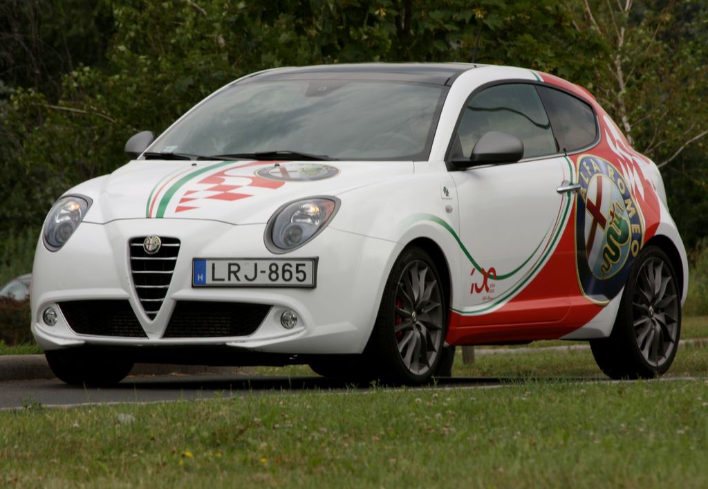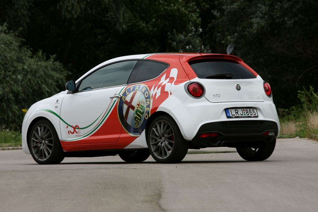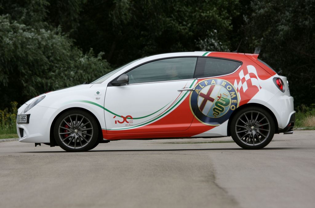 Mivel a MiTo esetében fontos a perszonalitás, a személyre szabhatóság, az Alfa tartozékkatalógusa többféle dekorációt, illetve karosszériára ragasztható matricát kínál a típushoz. A tesztautó megjelenése azonban egyedi, és mint ilyen, ez a látványos matricázás egyik Alfa Romeo kereskedésben sem rendelhető meg opcióként. Az importőr a márka 100 éves jubileumának tiszteletére alkotta meg ezt a stílusosan feltűnő mintázatot, és a kivitelezéssel megbízott műhely gyakorlatilag az egész karosszériát beborította a hófehér alapon színes motívumokat felvonultató fóliával.