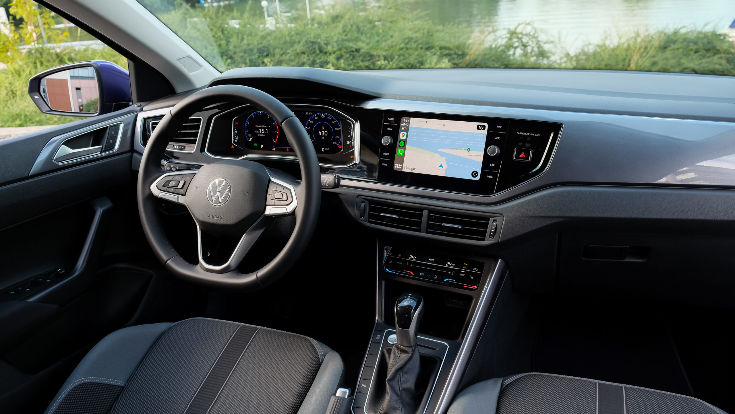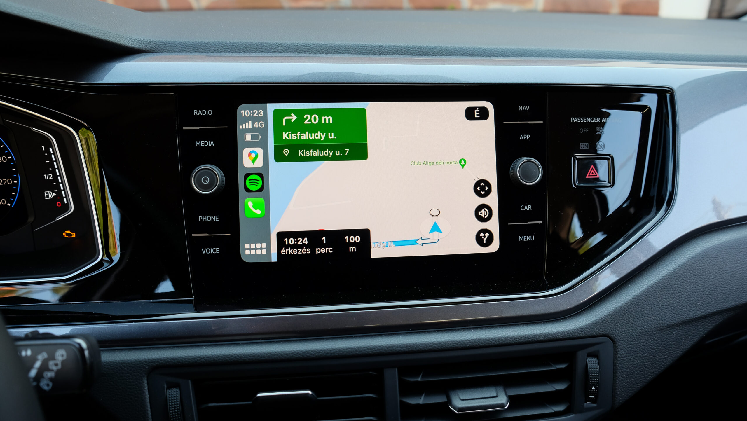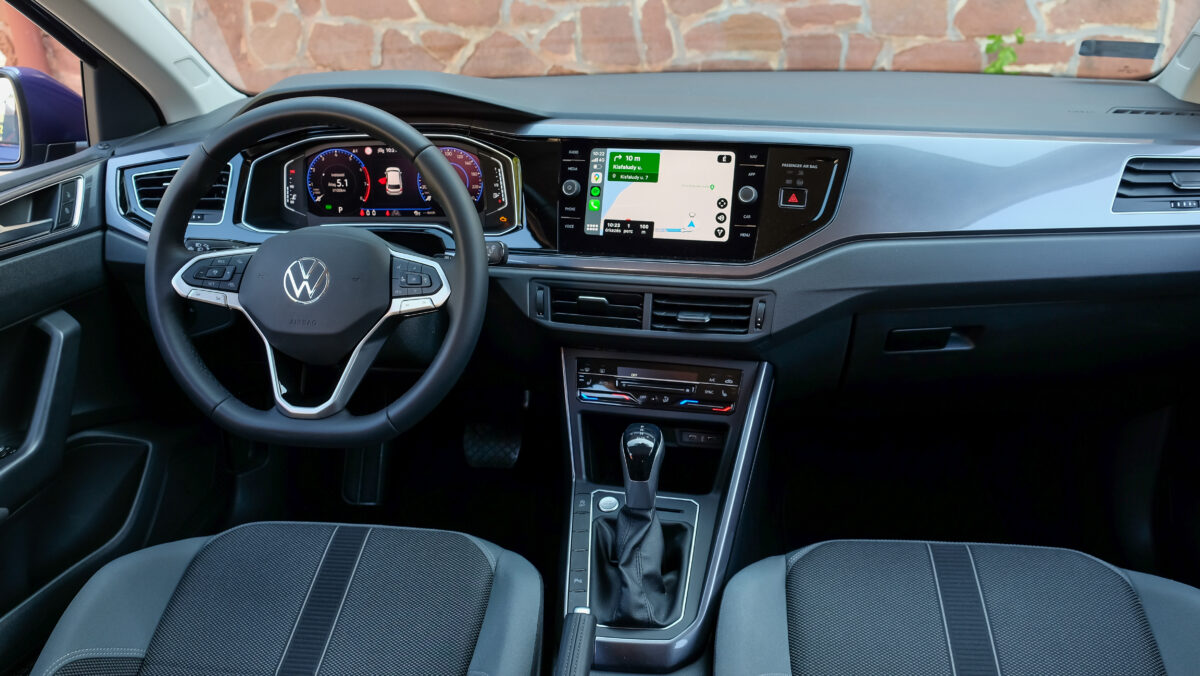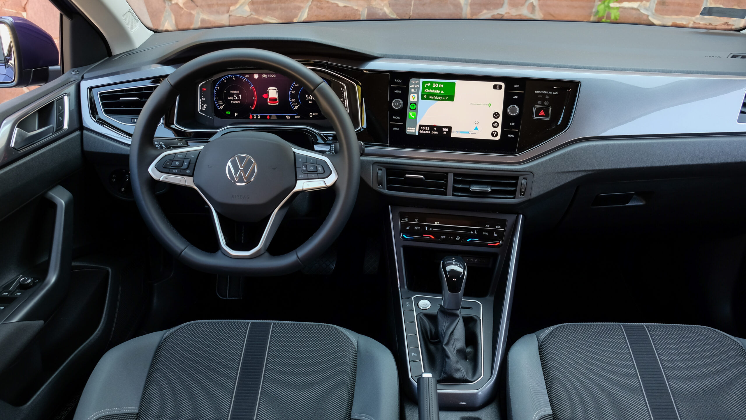 Oké, nem olyan óriási, mint az aktuális Skoda Fabia, de így is felnőtt már ahhoz a Polo, hogy akár családi használatra is alkalmas legyen. Nem fényűzően tágas, de átlagtermettel négy felnőtt is belefér, két gyerekkel gond nélkül el lehet vele lenni. Csomagtere 351 literes, álpadlóval sík padlóval bővíthető, de ez eddig is így volt. Új viszont a kormánykerék, pontosabban leginkább a közepe, az alapáron teljesen digitális, akár a gyári navigációt is megjelenítő műszerblokk és a már vezeték nélküli Apple CarPlay/Andrid Auto funkciós infotainment.