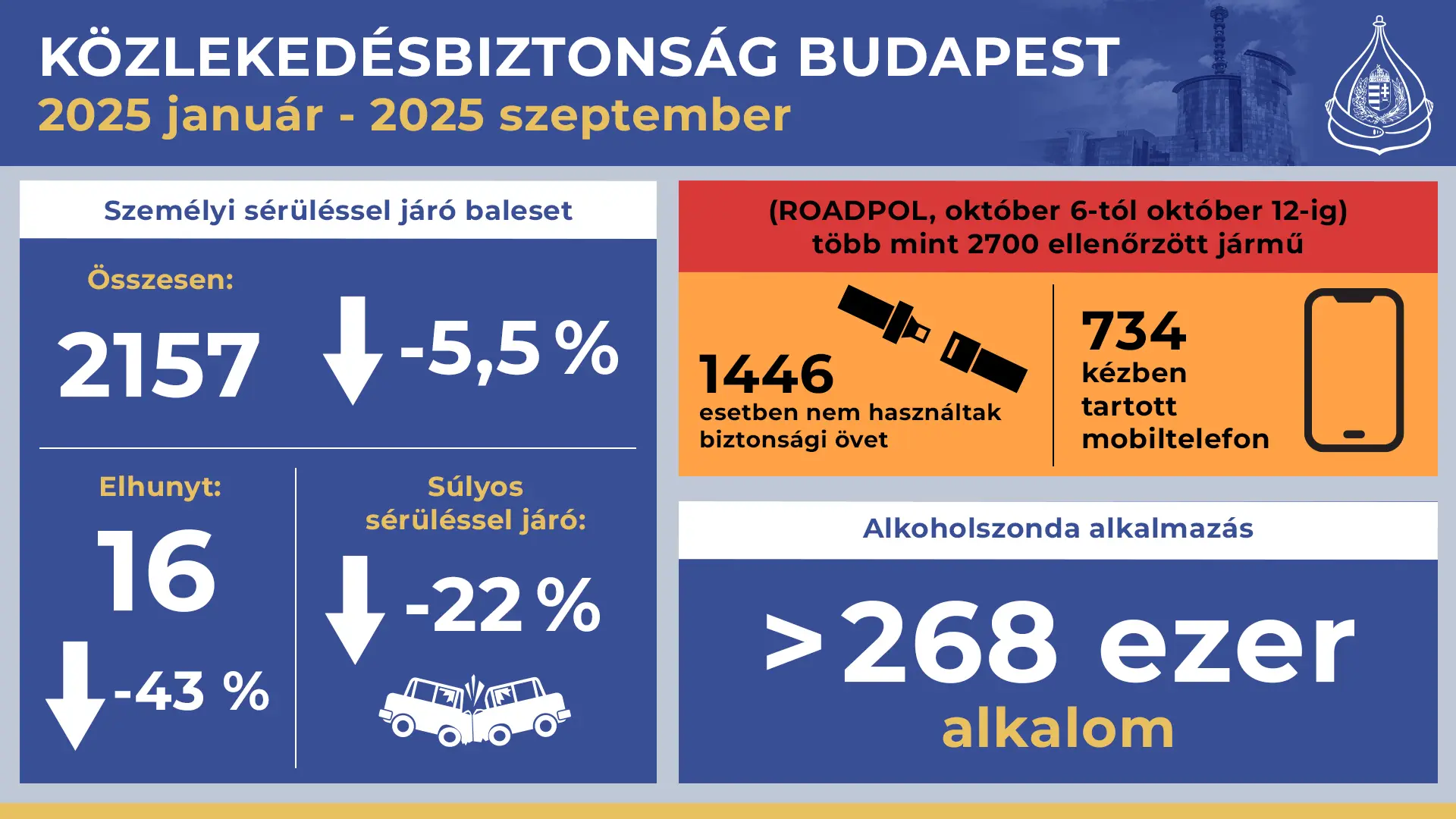 Ami a budapesti statisztikákat illeti: idén szeptember végéig bezárólag 16-an vesztették életüket a főváros útjain. Ez 43 százalékos csökkenés a múlt év azonos időszakához képest, míg a súlyos balesetek száma 22 százalékkal mérséklődött. Az ütközések hátterében továbbra is a gyorshajtás, a figyelmetlenség, az elsőbbségadás elmulasztása, és az előzés szabályainak megszegése áll. Ugyanakkor a csökkenő tendencia mindenképpen bizakodásra ad okot.