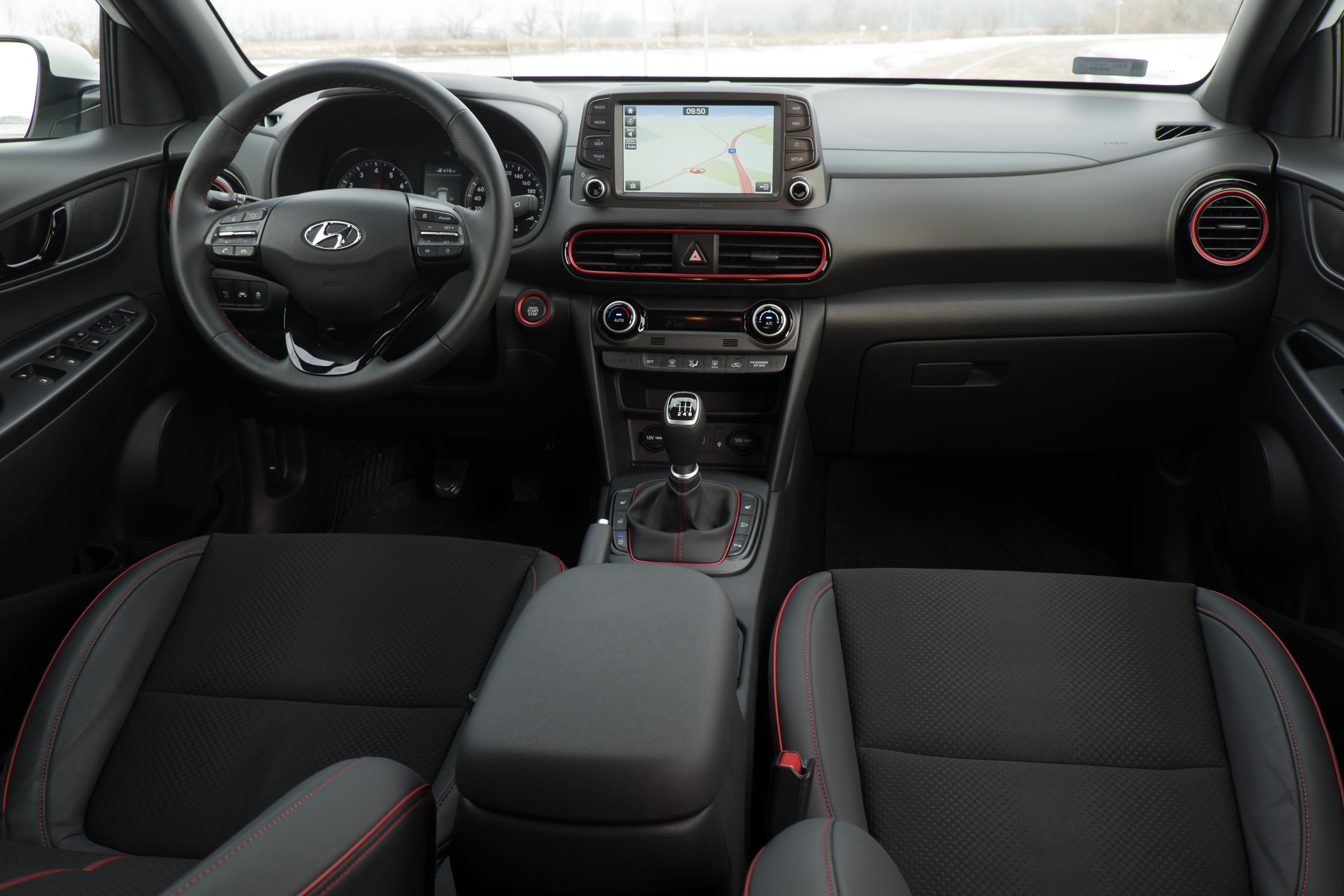 Magasabb, mint egy hagyományos személyautó, az ülés is magasabban van, a kilátás sem rossz, de az orra is furcsán magas, azért nem olyan, mint egy rendes SUV-ban. Bent is különös dolgok fogadnak, a Kona ugyanis egy kis életstílus-autó érzést is hoz. A gyáva fehér külső fényezés egyébként lehet látványos zöld, vagy világoskék, viszont bent is választhatunk színcsomagot. Ilyenkor kis keretet kapnak a légbeömlők, a kormány varrása is színes lesz, valamint az ülések varrásai, de ami a legfontosabb, hogy a biztonsági övek is, itt épp vörösek. Egyébként minden fekete, ami kicsit komorrá teszi odabent, viszont a formák jók, az anyagok sem kevésbé, de túl sokat ne várjunk, a kemény műanyag elég sok helyen feltűnik, ami csak akkor érdekel, ha nagyon kukacoskodni akarunk, egyébiránt teljesen korrekt.Egyszerű anyagok, kellemes formák, logikusan elhelyezett kezelőszervek, és jó az üléspozíció is