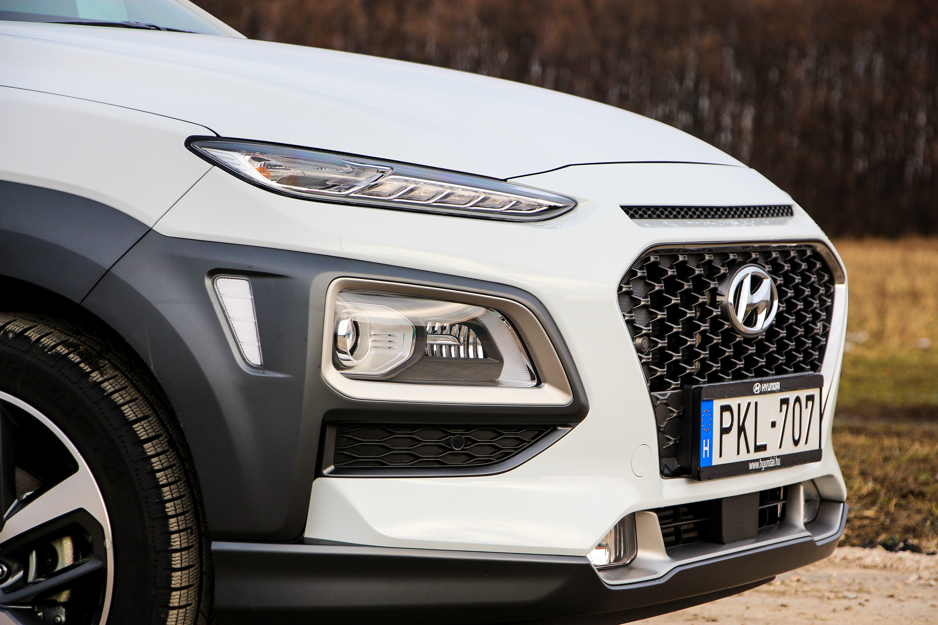 Napról napra egyre meglepőbb autókkal rukkolnak elő a koreaiak, de mindegyikben van egy valami közös, hogy meglepően jók. Összeszerelésre, minőségre nagyjából azt kapjuk, amit ennyi pénzért elvárunk, az európai ízlés alapján megrajzolt formák pedig számunkra is teljesen emészthetőek. A Konát szokni kell, a háromfelé osztott első fényszórók elég érdekesek egy olyan világban, ahol például az Audi az A8-nál arra törekedett, hogy mindent egy lámpatestbe építhessen. Persze, a halogén izzóknak hely kell, és a külön beépített főfényszóró és nappali menetfény teljesen érthető, de a legalsó szinten még megtaláljuk a feláras ködlámpát is. Hátul ugyanez a helyzet, fönt van egy dizájnos helyzetjelző test, a fontos izzókat meg Suzuki Wagon R módjára a lökhárítóba építették. Lökhárító, ember legyen a talpán, aki itt meg tudja mondani, mettől meddig tart, a matt szürkére fényezett elemek mindenbe belelógnak. Lehet róla beszélni, az tuti, mindenhol történik rajta valami izgalmas.
