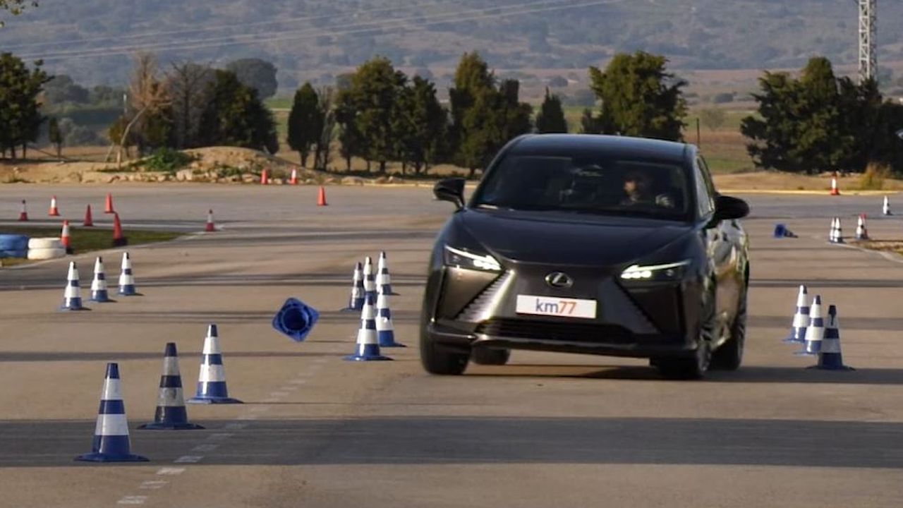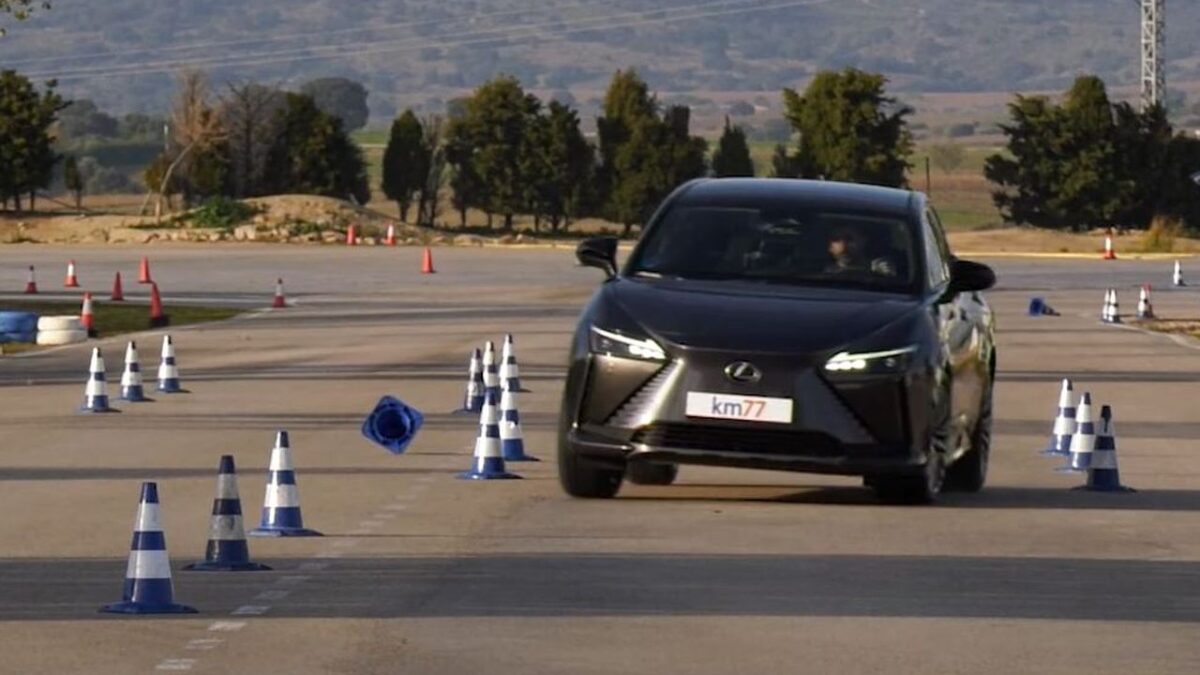 Szokásosan a szlalomozással kezdte az RZ 450e vallatását a km77.com csapata legújabb tesztjükben, a Lexus pedig ügyesen kerülgette a bójákat - néhány megingást leszámítva. A szem viszont könnyen tévedhet, az óra viszont kegyetlenül őszinte, ám nincs miért szégyenkeznie az RZ-nek, hiszen jobb időt futott mint a Cupra Born vagy éppen a Mercedes EQE 350+. A jávorszarvasteszten már kevésbé érezte magát komfortosan. Az első próbálkozásnál (ahol a sofőr még nincs tisztában az autó viselkedésével) az utolsó bójasorba be sem tudott fordulni, és a második oszlopból is magával vitt egy terelőt. A legjobb próbálkozásnál a Sport módot kellett elővenni a sikeres teljesítéshez, ám a bemeneti tempó így is csak 72 km/óra lett, míg az utolsó bójasort 43 km/órával hagyta el az RZ. Egy későbbi próbálkozásnál az ECO módban is sikerült kis híján makulátlanul teljesíteni a manővert, ráadásul azonos bemeneti tempóval a kimeneti sebesség jóval magasabb, 52 km/óra lett, de egy terelőt érintett a jobb első kerék.