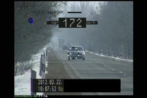 2012. február 22-én, 55-ös számú főúton, lakott területen kívül, 172 km/h-t mért a traffipax berendezés az alábbi gépjármű elhaladtával, míg a megengedett legnagyobb sebesség 90 km/h. 130.000 Ft a közigazgatási bírság összege, mivel 82 km/h-val lépte túl a megengedett sebességet.
