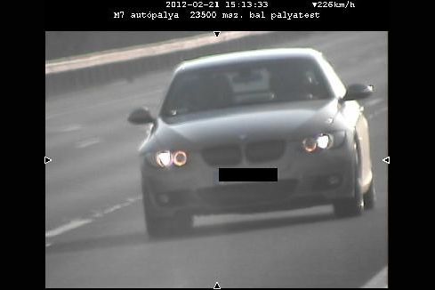 2012. február 21-én, M7-es autópálya, autópályán, 226 km/h-t mért a traffipax berendezés az alábbi gépjármű elhaladtával, míg a megengedett legnagyobb sebesség 130 km/h. 130.000 Ft a közigazgatási bírság összege, mivel 96 km/h-val lépte túl a megengedett sebességet.