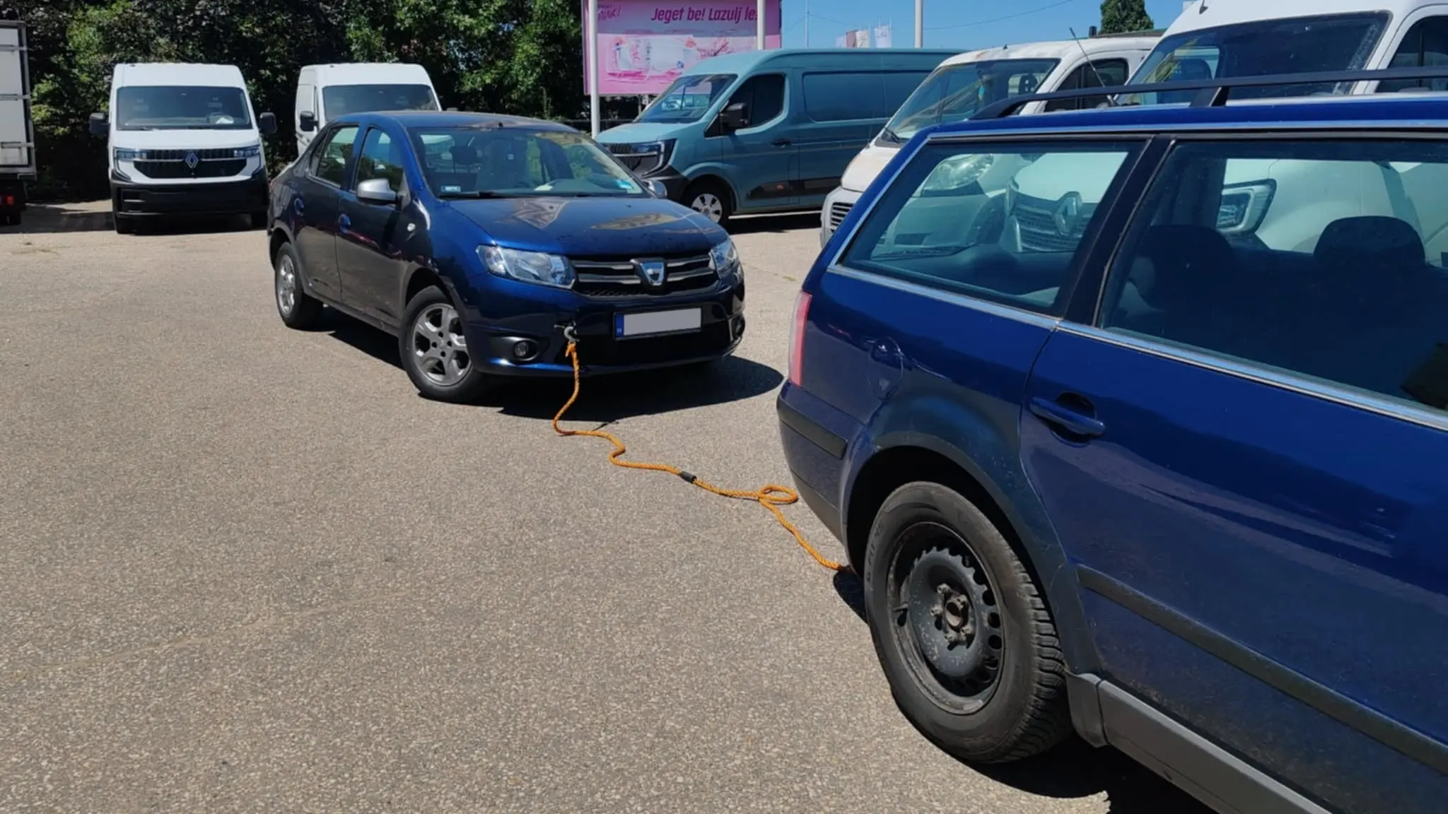 Készülünk a vontatásra: ha nem is saját erejéből, de legalább a saját kerekein gurulva jutott ki a márkaszervizből a Logan