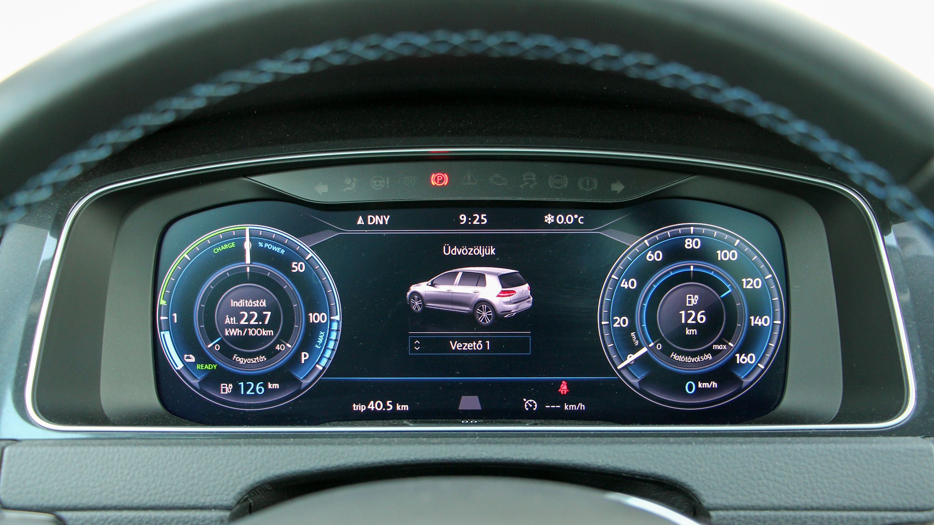 További plusz pont a Leafnél, hogy egyrészt nagyobb teljesítményű, 110 kW-os, 320 Nm nyomatékú motort kapunk hozzá, s 100 km/órára gyorsulása is jobb, nem is szerény 1,7 másodperccel, így a Leaffel 7,9 másodperc alatt is meglehet a 100-as sprint. Végsebességben az e-Golf 150, a Leaf 144 km/órát enged, mindkettő elektronikus korláttal. Ami viszont fontosabb, hogy a Leaf esetén van e-Pedal, amivel egy gombnyomásra kapunk egypedálos vezethetőséget, ami elsőre fura lehet, de nagyon megszokható, s praktikus, egyedül talán parkoláshoz érdemes kikapcsolni, hogy legyen kúszás. A motorfék, pontosabban a visszatáplálás amúgy az e-Golf esetén is állítható, ám túl sok fokozatban, s a leginkább intenzív sem olyan, mint amit a Leaf e-Peadalja ad. A Golfban a hagyományos automatáktól megszokott karral választható az irány és a visszatermelés mértéke, míg a Leafben elektromos kapcsolókkal. Összességében elmondható, hogy a Leaf villanyautósabb, az e-Golf pedig egy hagyományos autó villanymotoros változata.